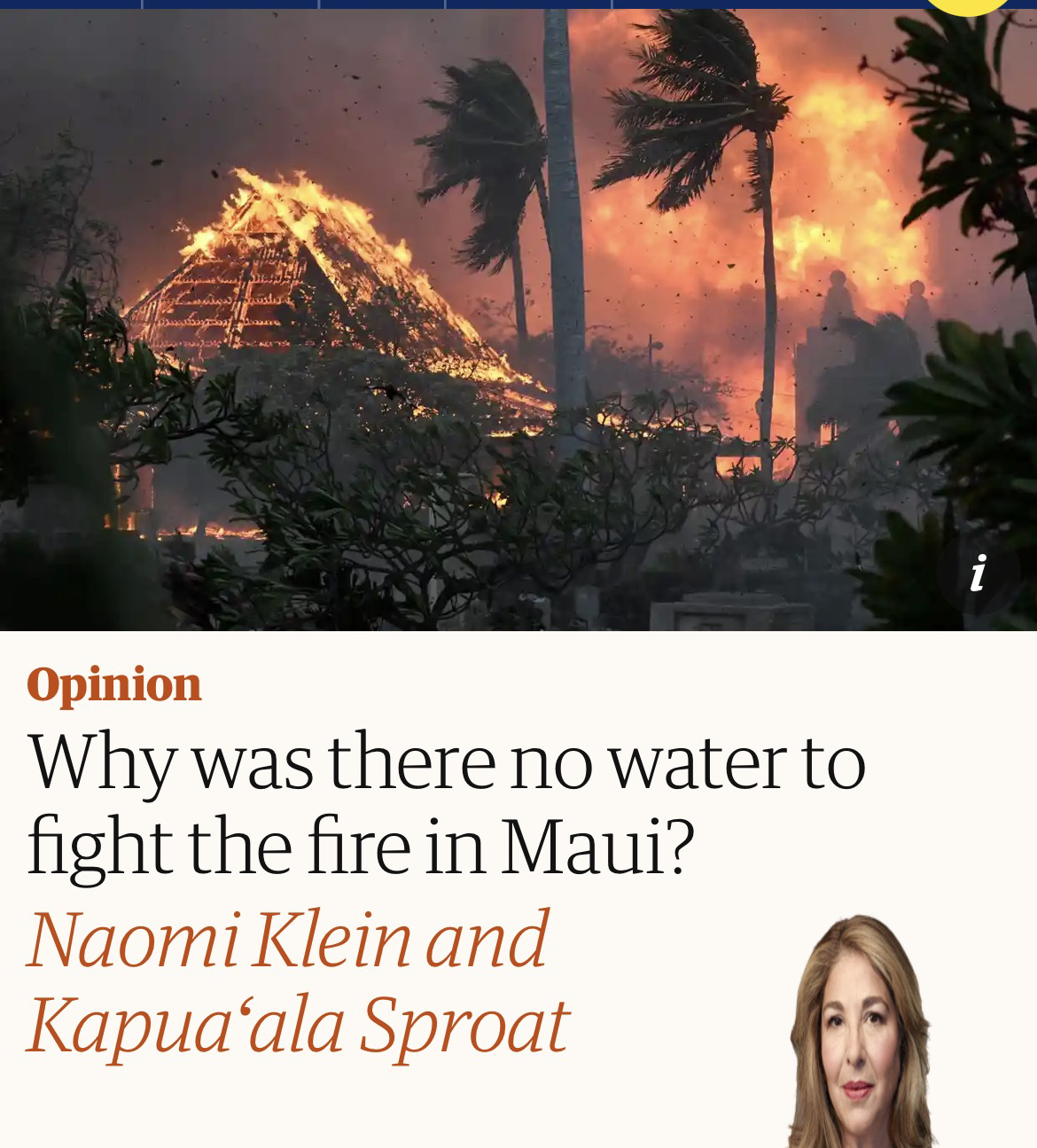 Maui Water Rights: "Tereariʻi, a grassroots attorney, already knew that the fight for Maui’s future was about to intensify, and at its heart would not be fire, but another element entirely: water. Specifically, the water rights of Native Hawaiians, rights that a long parade of plantations, real estate developers, and luxury resorts have been stifling for nearly two centuries. As the flames approached, Tereariʻi feared that, under cover of emergency, those large players might finally get their chance to grab west Maui’s water for good." https://www.theguardian.com/commentisfree/2023/aug/17/hawaii-fires-maui-water-rights-disaster-capitalism