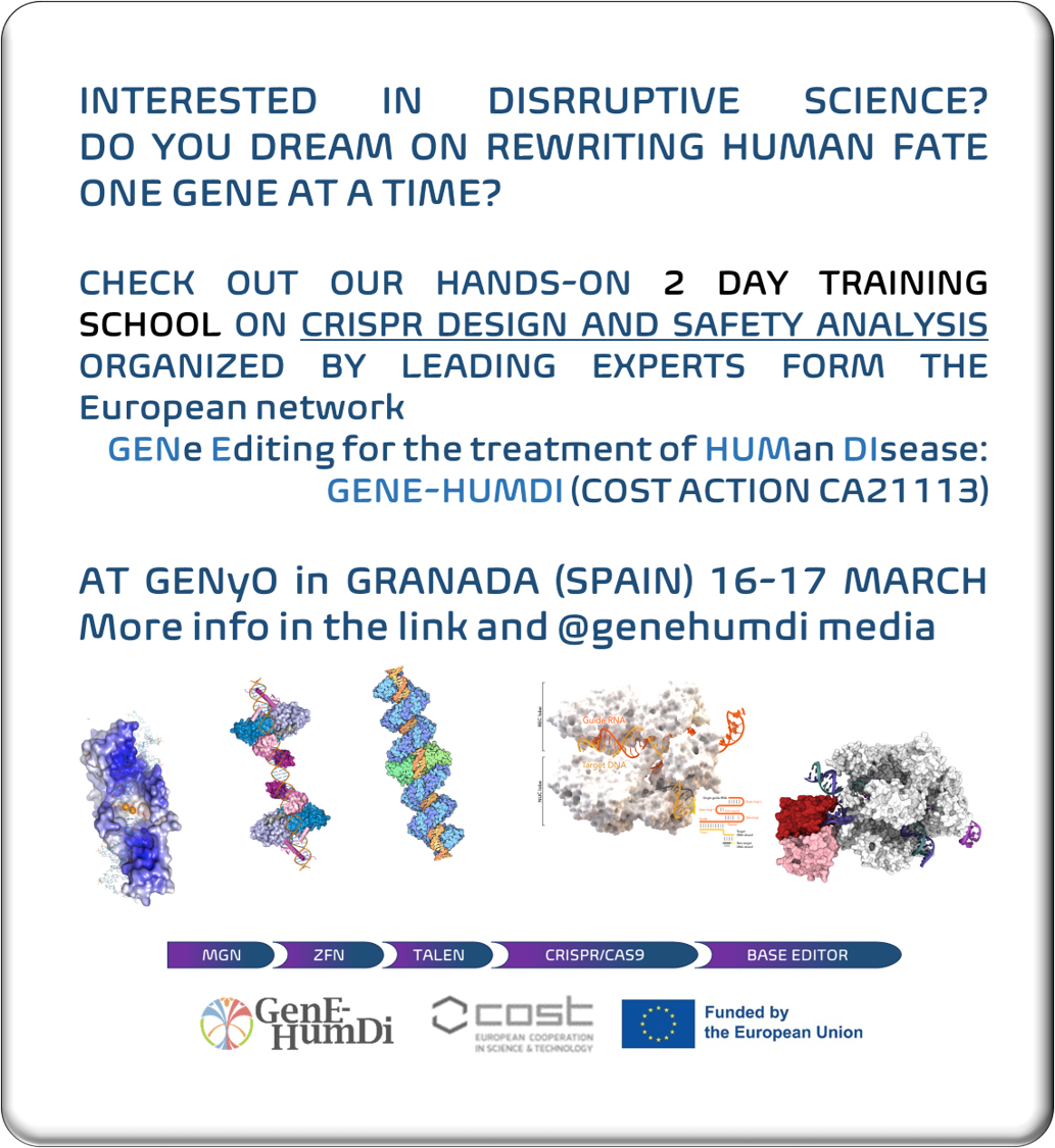 You can still apply to the Hands-on course that the new network Gene Editing for the treatment of Human disease ( GeneHumdi | COST action CA21113) is organizing in GRANADA next 16-17 March. You will learn form leader scientist More info about the program can be fount here: