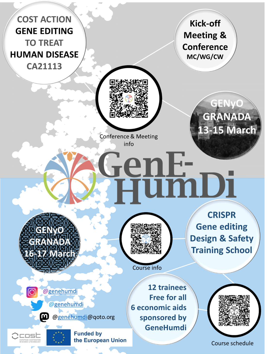 The first meeting of the European network of gene editing for the treatment of human diseases (GeneHumdi | COST ACTION 21113) Meeting and Conference will be held in GRANADA , Spain, 13-15 March.