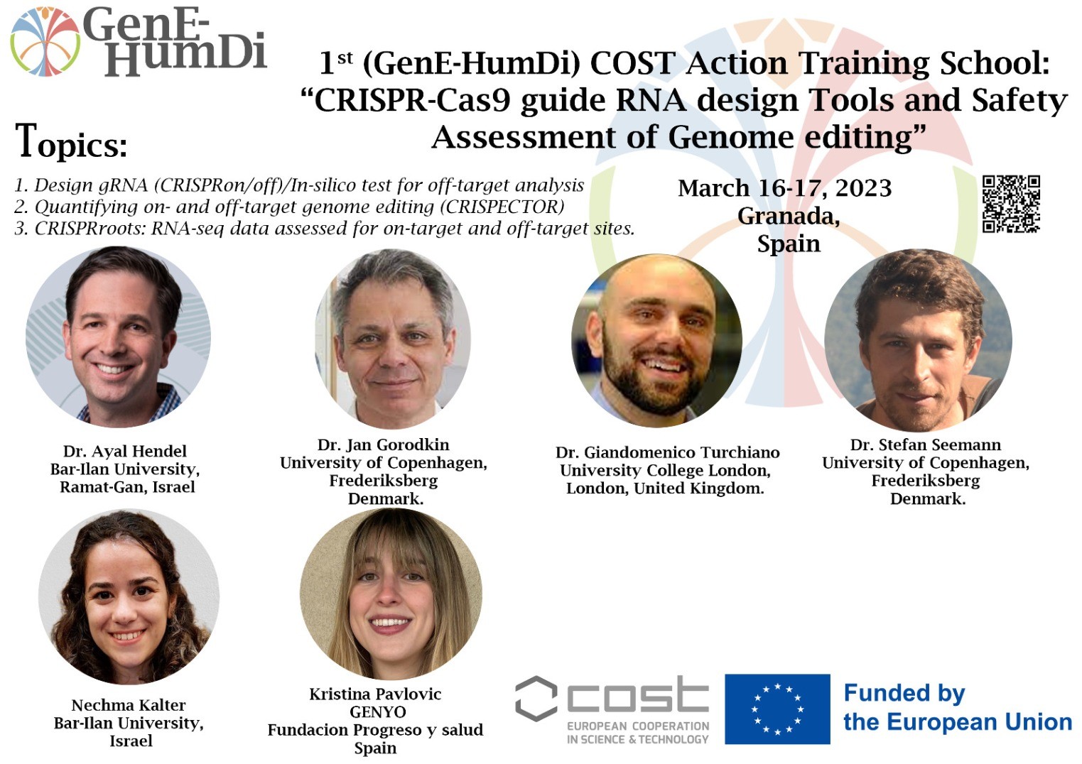 This Training School is an initiative of the GenE-HumDi network and has been organized by leading experts in gene editing translation and genotoxicity: Dr. Ayal Hendel (Bar-Ilan University), Dr. Karim Benabdellah, Dr. Javier Molina (Genyo), Dr. Stefan Seeman (University of Copenhagen), Dr. Giandomenico Turchiano (University College of London).