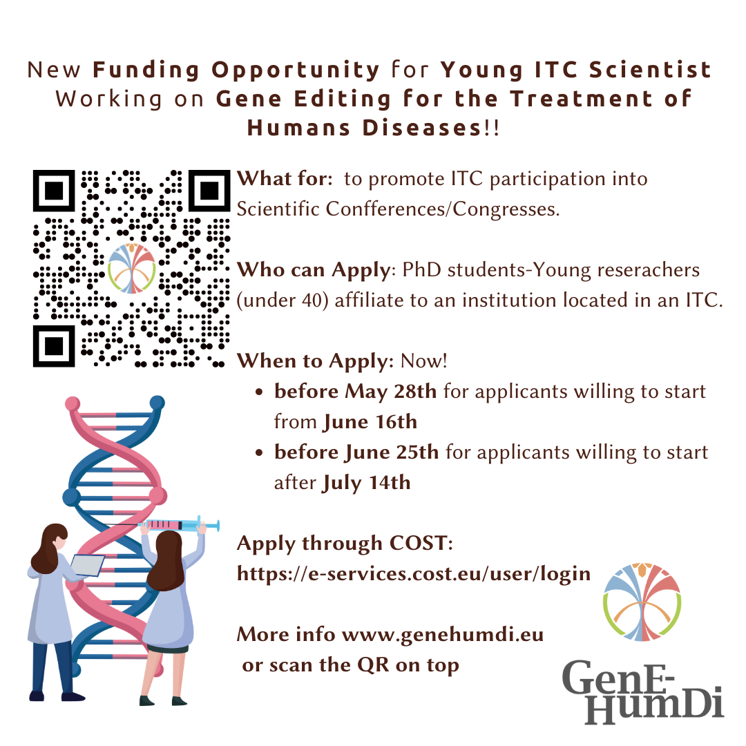 COST Action CA21113, Genome editing for the treatment of human disease: Gene-Humdi, is opening the 2024 call for Short Term Scientific Missions Soon. We provide funding opportunities for short stays in laboratory across EU. This year we also feature support for Inclusiveness Target Countries and or Near Neighbor Countries. You can prepare by learning more about our mission at www.genehumdi.eu or looking for a suitable mentor among our amazing members cost.eu/actions/CA21113/#tabs+