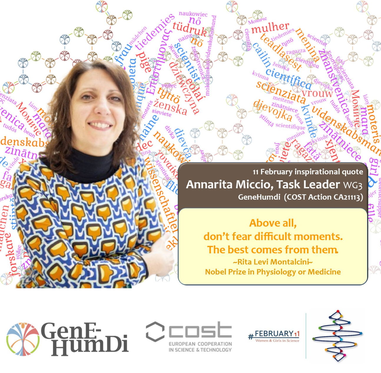 @qoto.GeneHumdi is proud to echo the Women and girls in Science Initiative. . We have inspiring leaders and top scientist in our network that are living proof of the excellence being directly dependent on talent, curiosity and hard work. Today, we feature Annarita Miccio inspirational quote, from no less than nobel Laureate Rita Levi Montalcini.