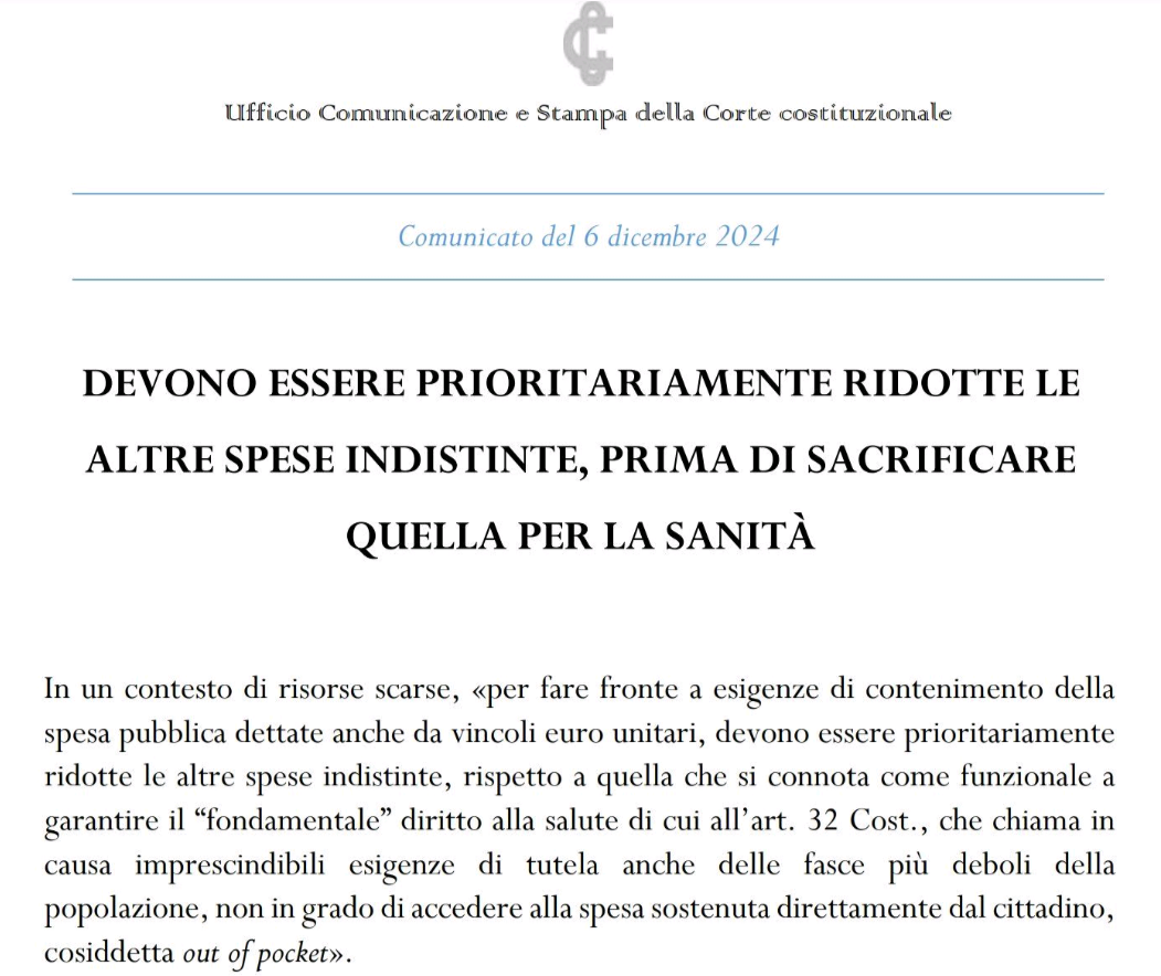 In un contesto di risorse scarse, «per fare fronte a esigenze di contenimento della spesa pubblica dettate anche da vincoli euro unitari, devono essere prioritariamente ridotte le altre spese indistinte, rispetto a quella che si connota come funzionale a garantire il "fondamentale" diritto alla salute di cui all'art. 32 Cost., che chiama in causa imprescindibili esigenze di tutela anche delle fasce più deboli della popolazione, non in grado di accedere alla spesa sostenuta direttamente dal cittadino, cosiddetta out of pocket»