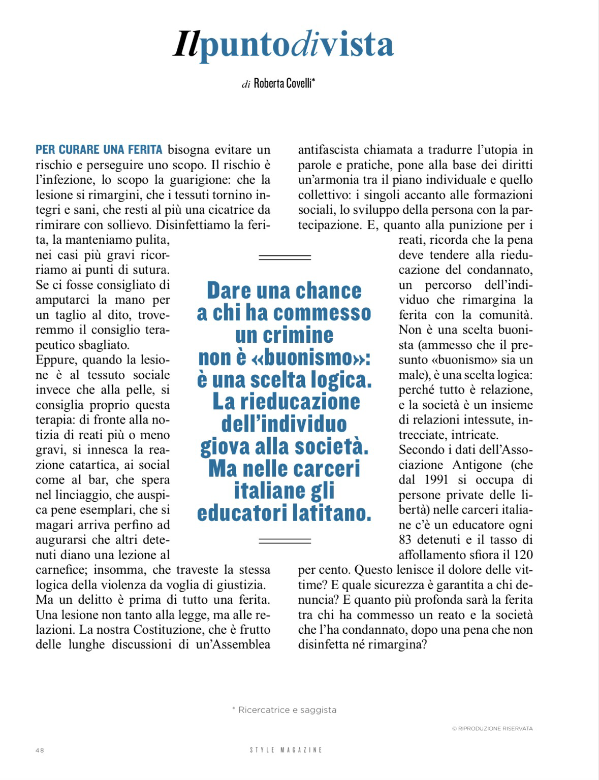 La rieducazione di chi consuma un crimine (come principio costituzionale contrario alla castrazione chimica, al “fine pena mai”, alle carceri tanto sovraffollate da diventare luoghi di tortura, al cannibalismo sociale che getta via le chiavi di ogni cella) non è ingenuo buonismo o ingiustizia verso le vittime, ma è un profondo bisogno sociale che scongiura la mutilazione di individui che non sono la parte malata della società, ma una parte di una società malata. @roberta_covelli lo spiega bene.