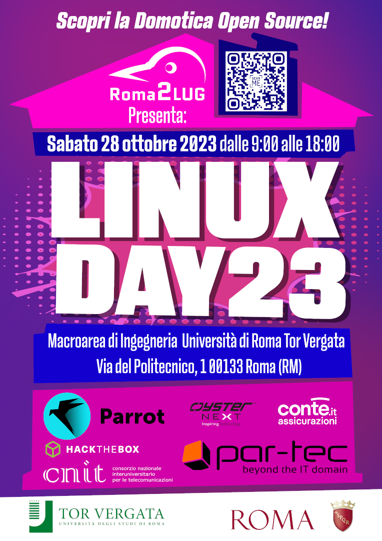 Torna a Roma il Linux Day! Organizzato dal Roma2LUG col patrocinio del Comune di Roma Capitale e dell'Università degli Studi di Roma "Tor Vergata".