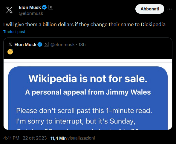 🇺🇸 Elon Musk ne ha fatta un'altra delle sue: in un post su X, ha annunciato la volontà di donare 1 miliardo di dollari a Wikipedia se cambiasse nome in D*ckipedia.