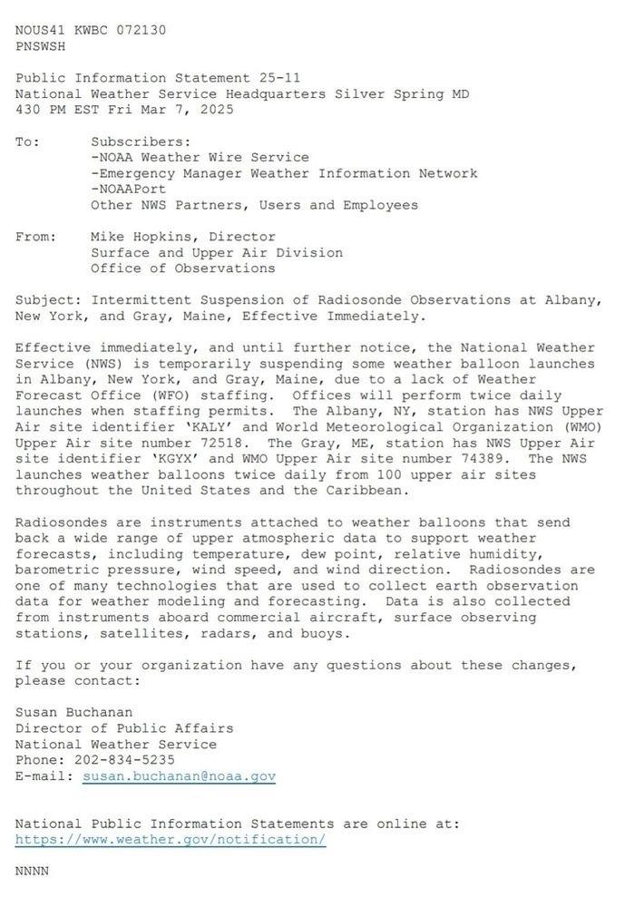 Radiosondes on weather balloons are essential for collecting data from the upper atmosphere for accurate forecasting. Due to the mass firing at NOAA, the NWS doesn’t have enough people to launch balloons. 🎈