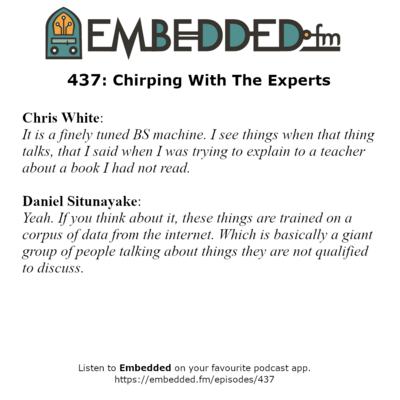 On this week's show(https://embedded.fm/episodes/437), we talked about ChatGPT. Here's some of what @Stoneymonster and Daniel Situnayake had to say on the subject: