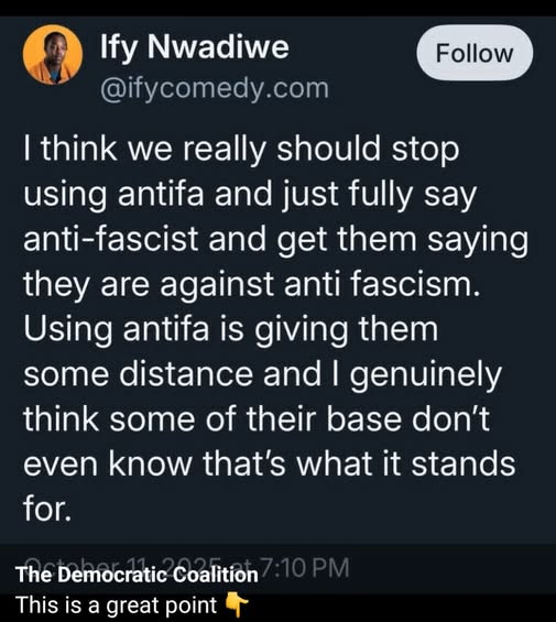 Noem: "One of the individuals we arrested recently in portland was the girlfriend of one of the founders of Antifa and we are hoping that as we go after her, interview her, and prosecute her, we will get more and more information about the network and how we can route them out and eliminate them from the existence of American society"