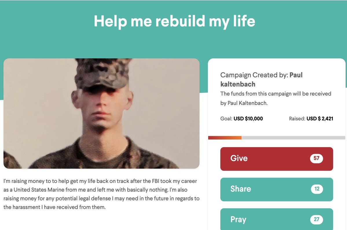 paul kaltenbach of rochester, NY is trying to raise $10,000 to get his "life back on track" after being kicked out of the marines on the eve of his boot camp graduation. he claims he needs the money for legal defense & that he is being harassed.