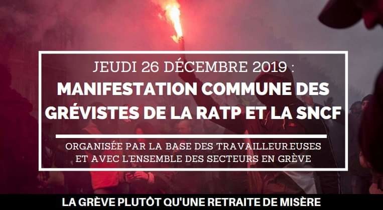 Appel à manifester aux côtés des grévistes RATP et SNCF ce jeudi 26 décembre. Départ à 13h gare de l'Est (rue d'Alsace).