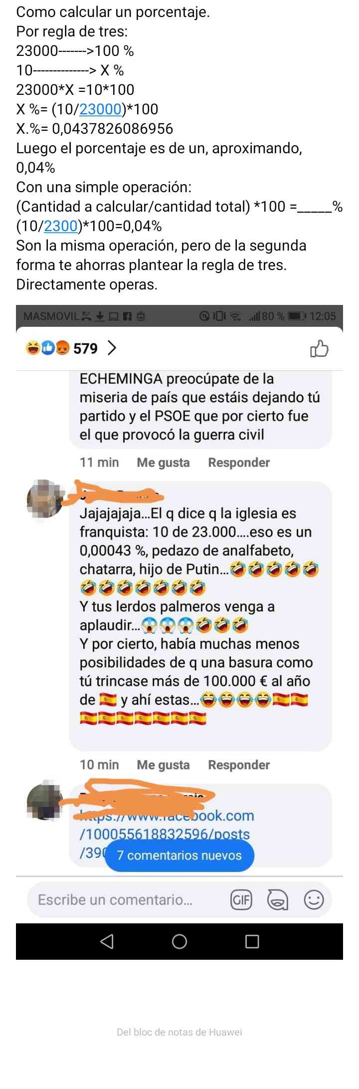Echenique, conste no lo defiendo al comesapos, pero coño no os cagueis en las mates y menos con un físico, ha publicado la probabilidad de equivocación de Casado de entrar en una Iglesia por equivocación. Vale, hay 23000 iglesias, 10 daban un homenaje al genocida unihuevo. No es tan difícil sacar la probabilidad. Pues nada un defensor de Casado, supongo votante, se chota de Echenique, previo papeo de un 100, así por la cara. Que sí figura, que para defender lo indefendible, si es necesario os cagais en las matemáticas. Lo que me sorprende es que no sé les derrames el cerebro por el oído. 👇👇