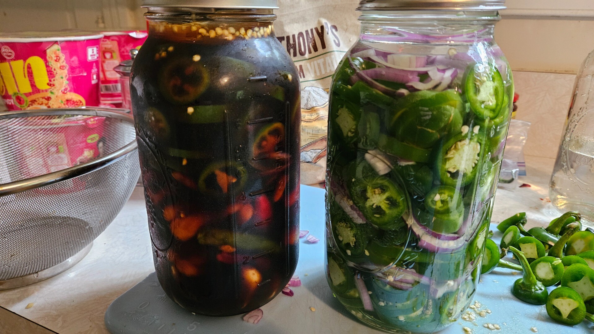 Mom picked up peppers at the local donation center. Left; habaneros, scorpions, and jalapenos in soy, mirin, and apple cider vinegar. Right; fresh jalapenos and red onion in brine for lacto fermentation over the next few days....