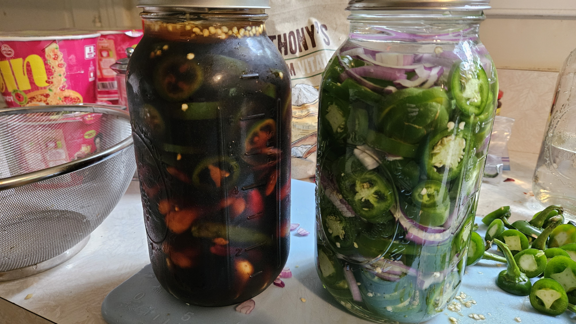 Mom picked up peppers at the local donation center. Left; habaneros, scorpions, and jalapenos in soy, mirin, and apple cider vinegar. Right; fresh jalapenos and red onion in brine for lacto fermentation over the next few days....