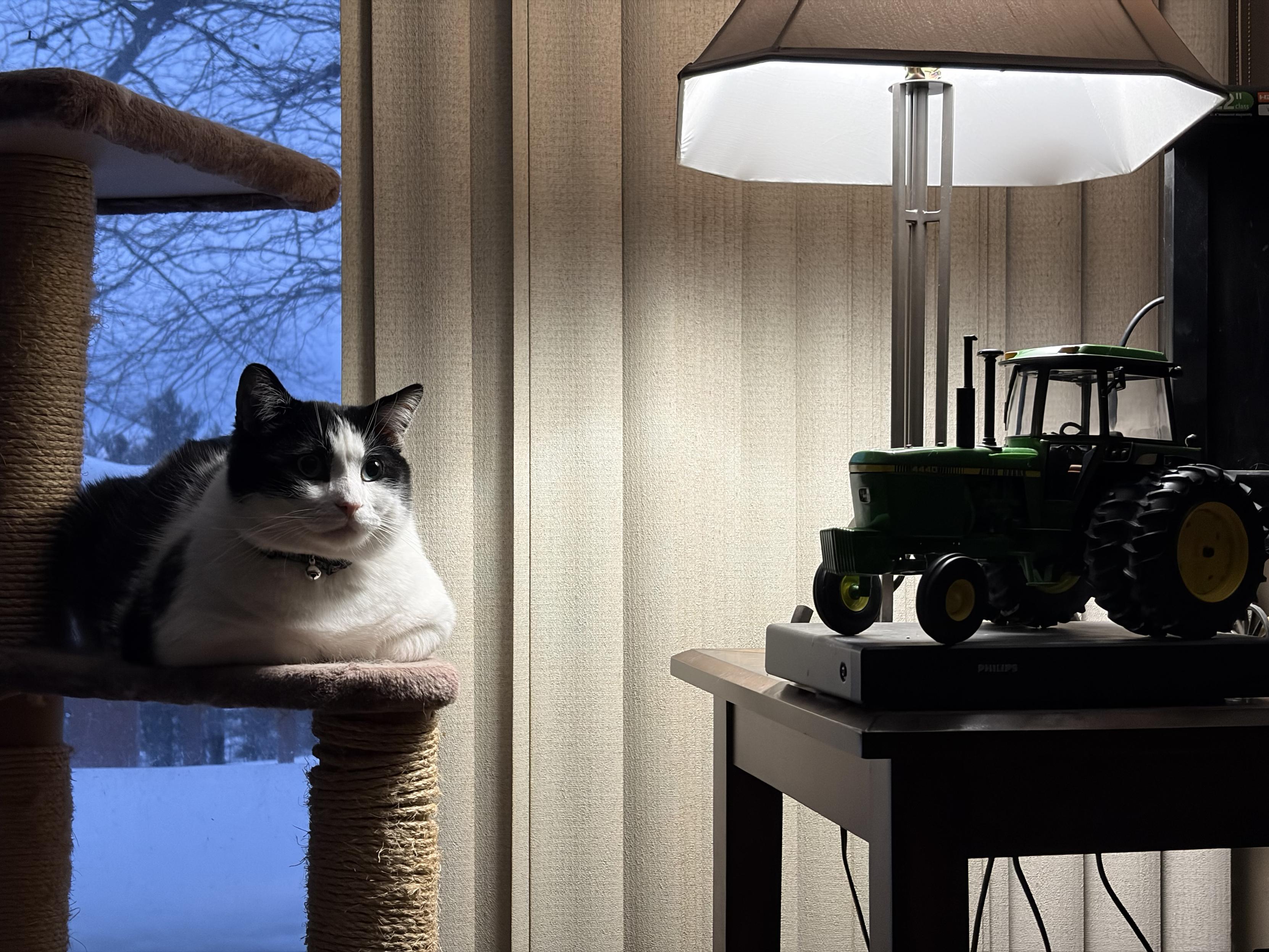 Two of my favorite things, my cat Nubs and one of my (yes, one of em) John Deere toy tractors, this one a 4440 with duals.