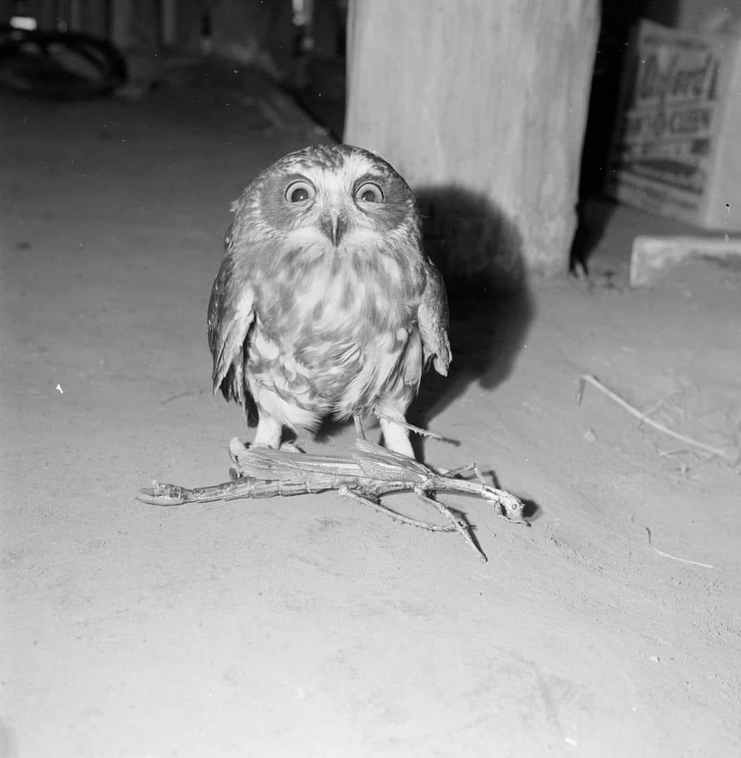 A surprised Boobook #owl with its catch of a stick insect is caught on camera by Australian News and Information Bureau photographer Harry Frauca, 1966.
