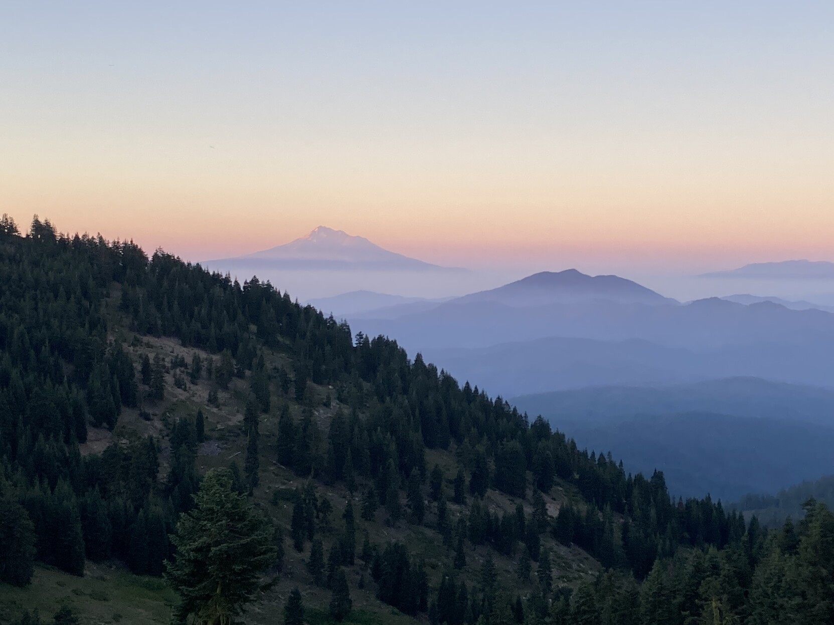 More floating mountains. Mount Shasta in the back sailing over 2021’s Lava Fire in #sunrise #BlueHour. Seen from #PCT in Oregon.