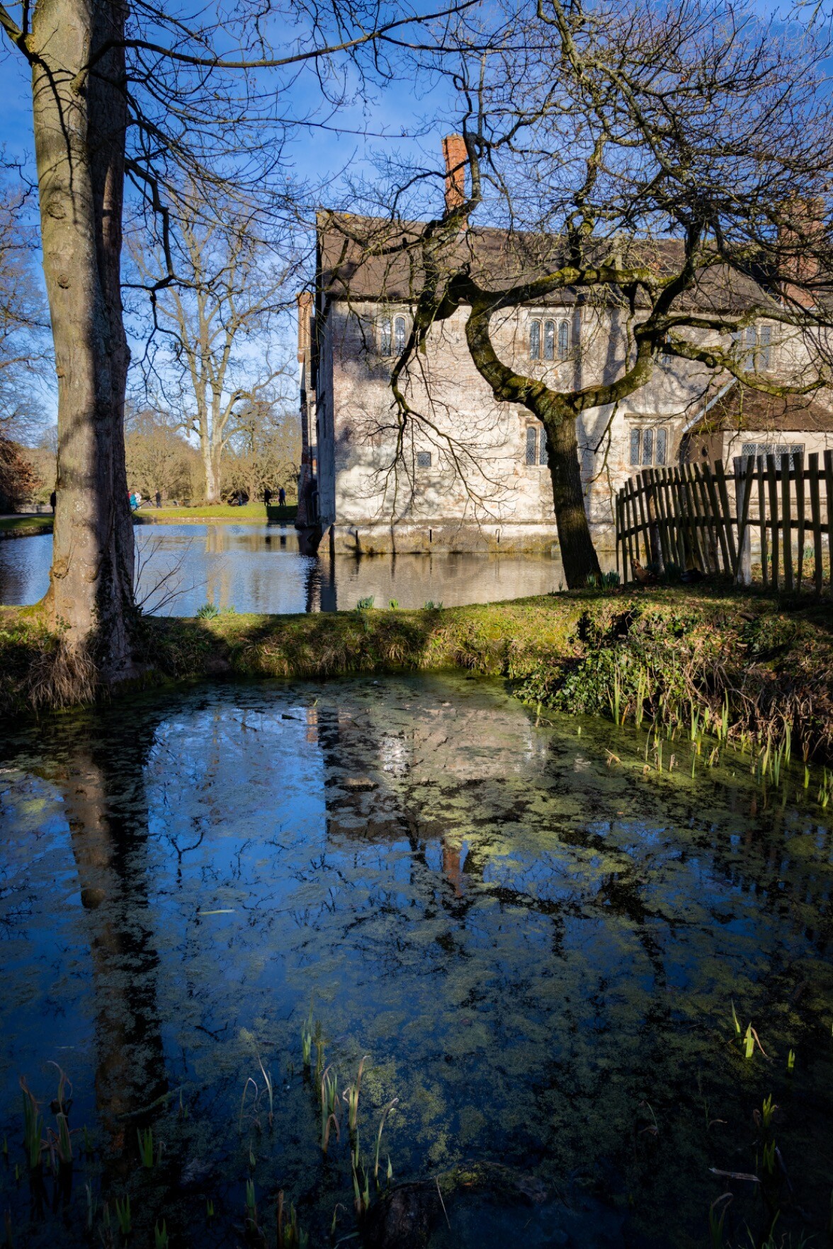 This photograph is of the house at Baddesley Clinton. A small pond before the moat surrounding the house.