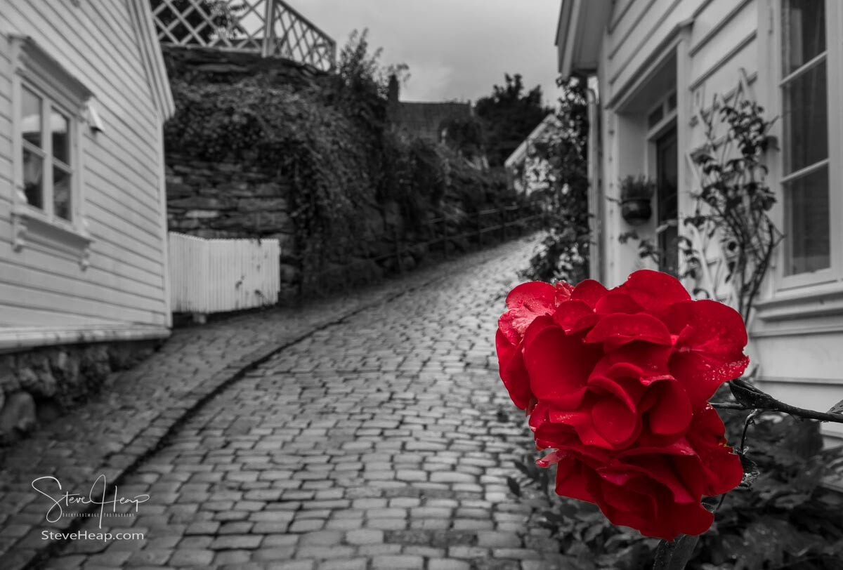 Sometimes a dash of color can make all the difference to a print. This black and white treatment of a wet road in Stavanger in Norway was lacking something and letting the natural color of the rose shine through made all the difference (I think!) steven-heap.pixels.com/feature #Stavanger #Norway #Monochrome #BuyIntoArt