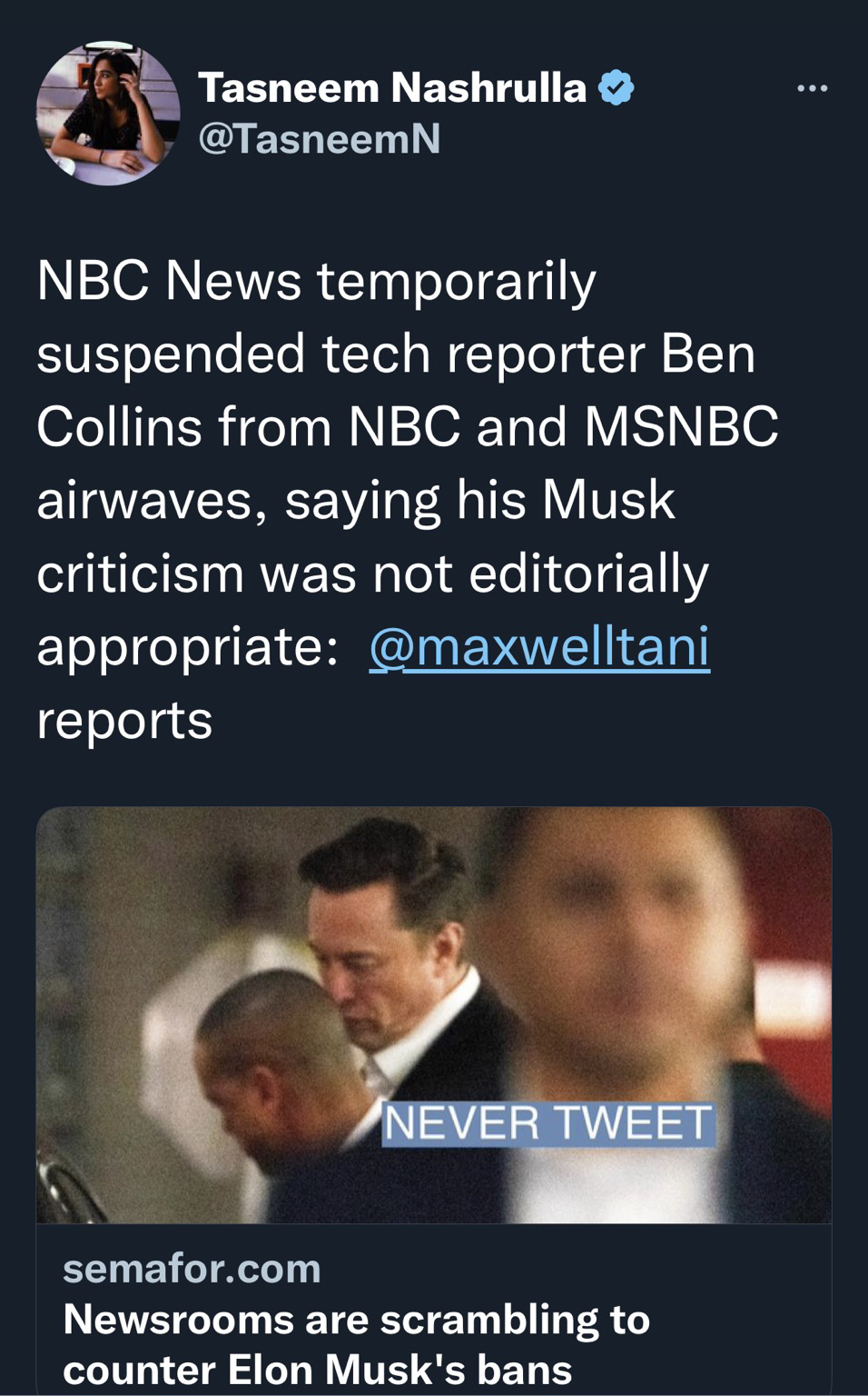 NBC has suspended Ben Collins - who was reporting last night on all of the journalists Elmo was tossing of Twitter.