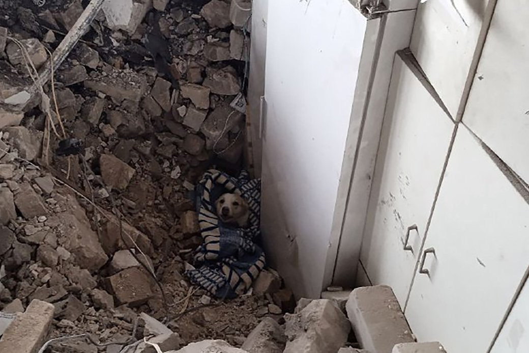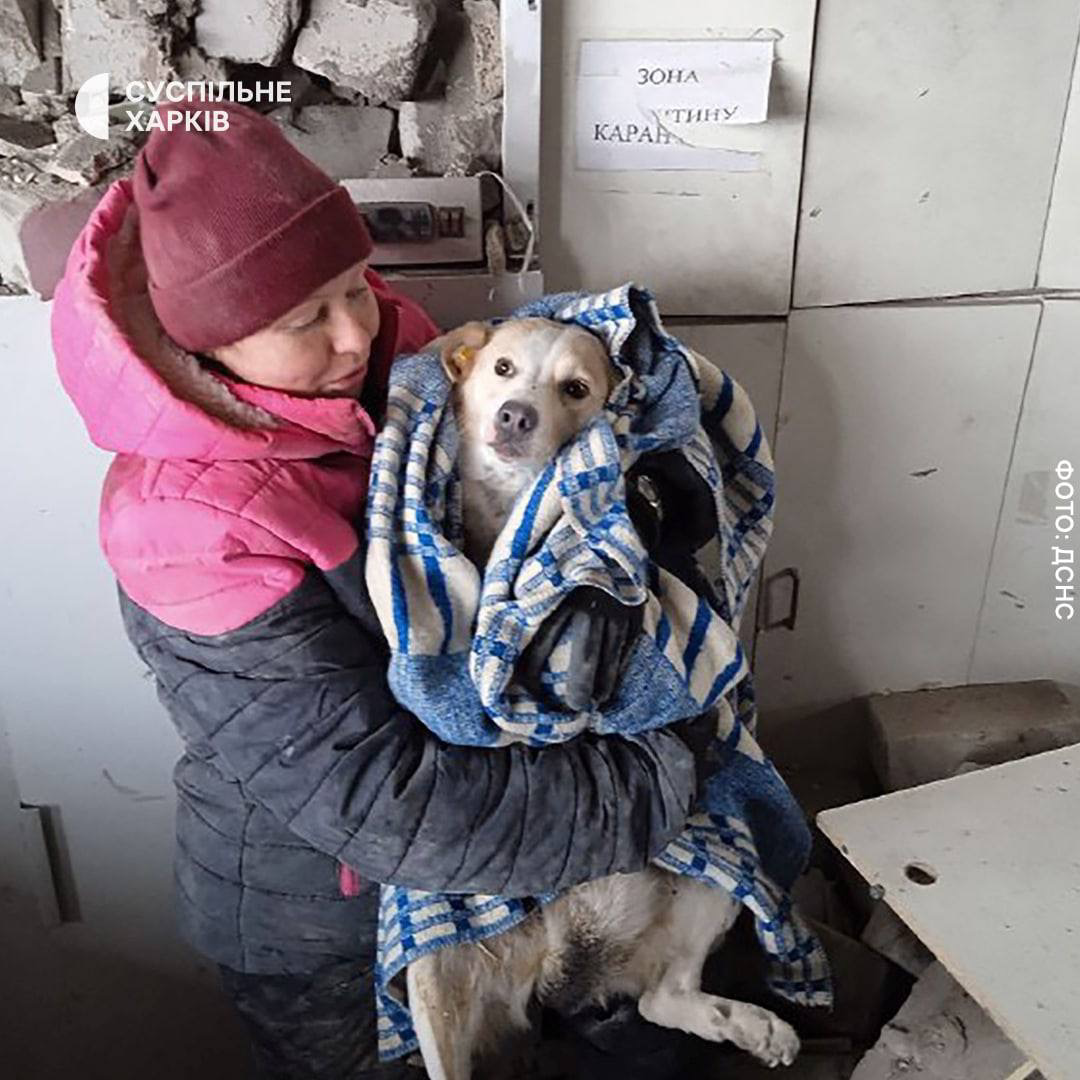 Today, as Russia attacked Kupiansk, Kharkiv region, with S300 rockets, a chemist’s was hit, leaving the dog seen in the photos trapped under the rubble.