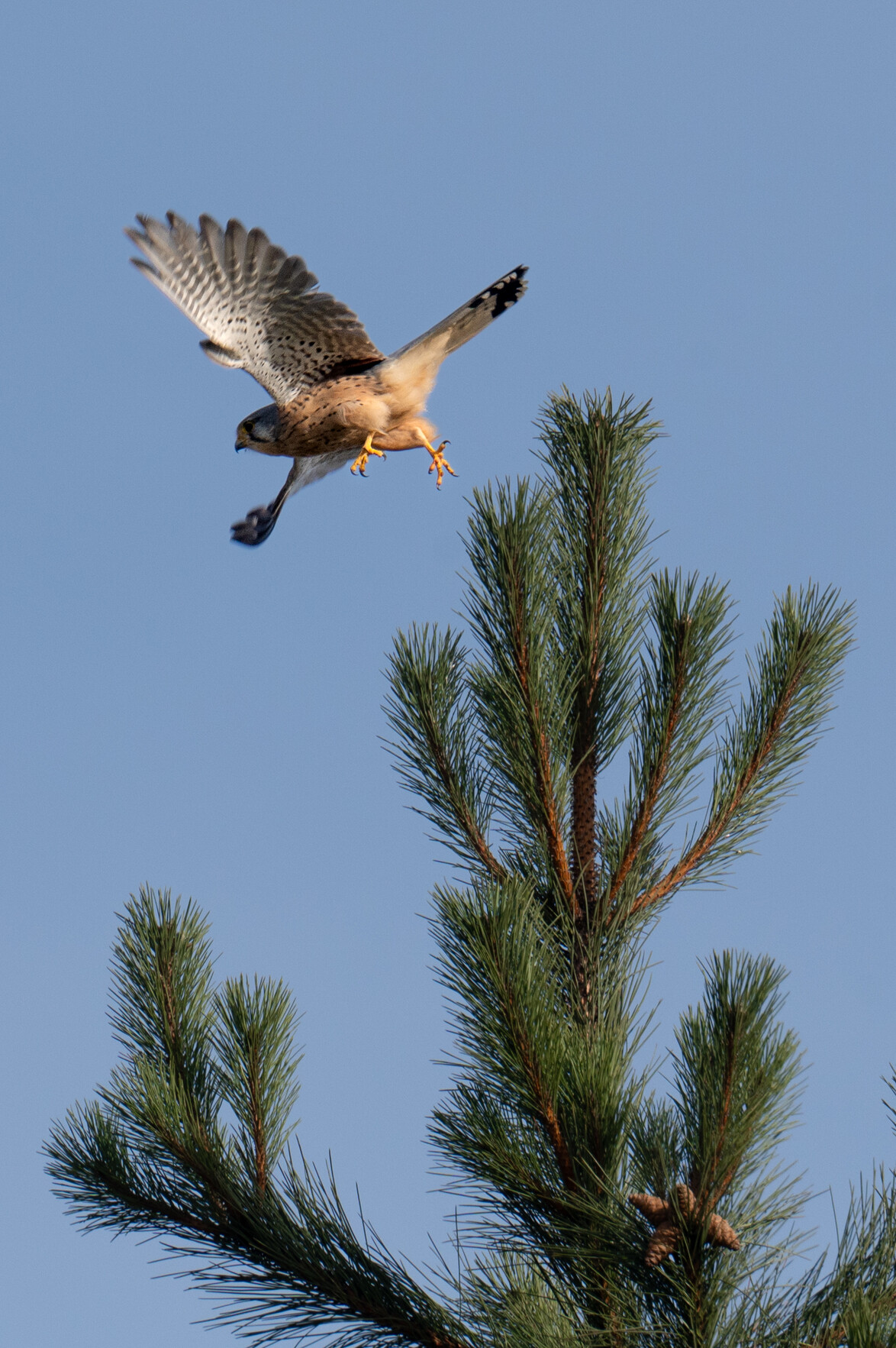 A Male Kestrel launches himself from the top of a very tall fir tree