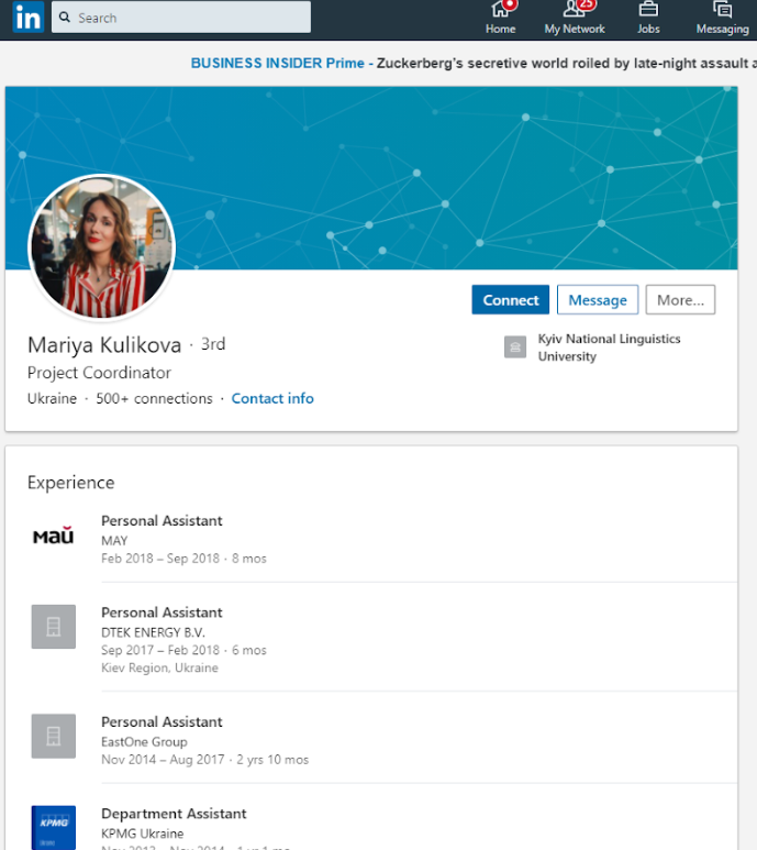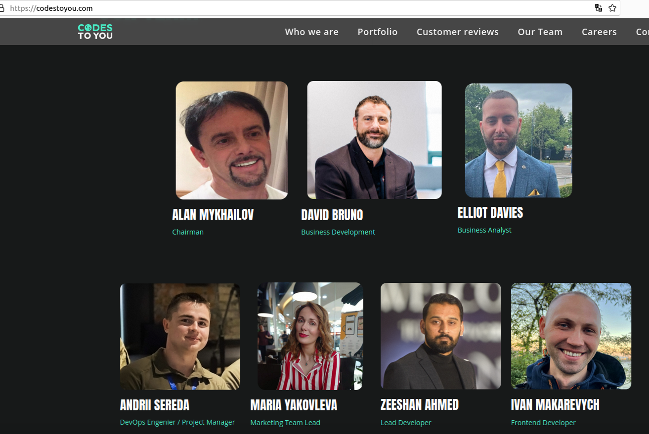 The Who We Are page of CodesToYou has several interesting profiles. For starters, the woman listed and pictured as the marketing team lead -- "Maria Yakovleva" -- is the exact same profile picture and first name used by the LinkedIn profile here, which used to list her experience as part of the executive team for the Private Office of John Bernard. She had a different name then, though: "Mariya Kulikova."