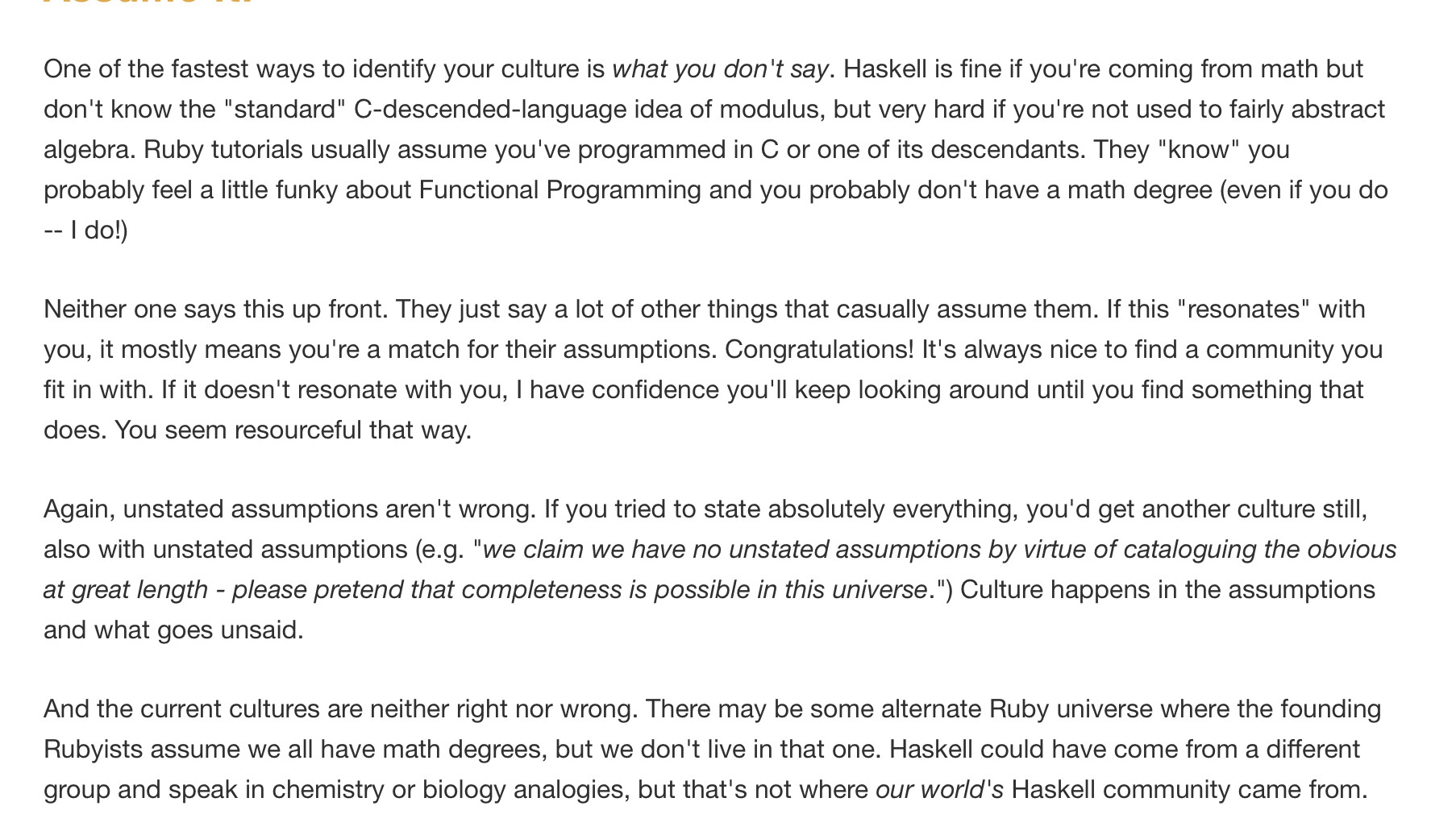 One thing I like about this perspective ( https://engineering.appfolio.com/appfolio-engineering/2018/4/23/ruby-haskell-culture-is-what-you-dont-say ) is that it simultaneously hits two related points.