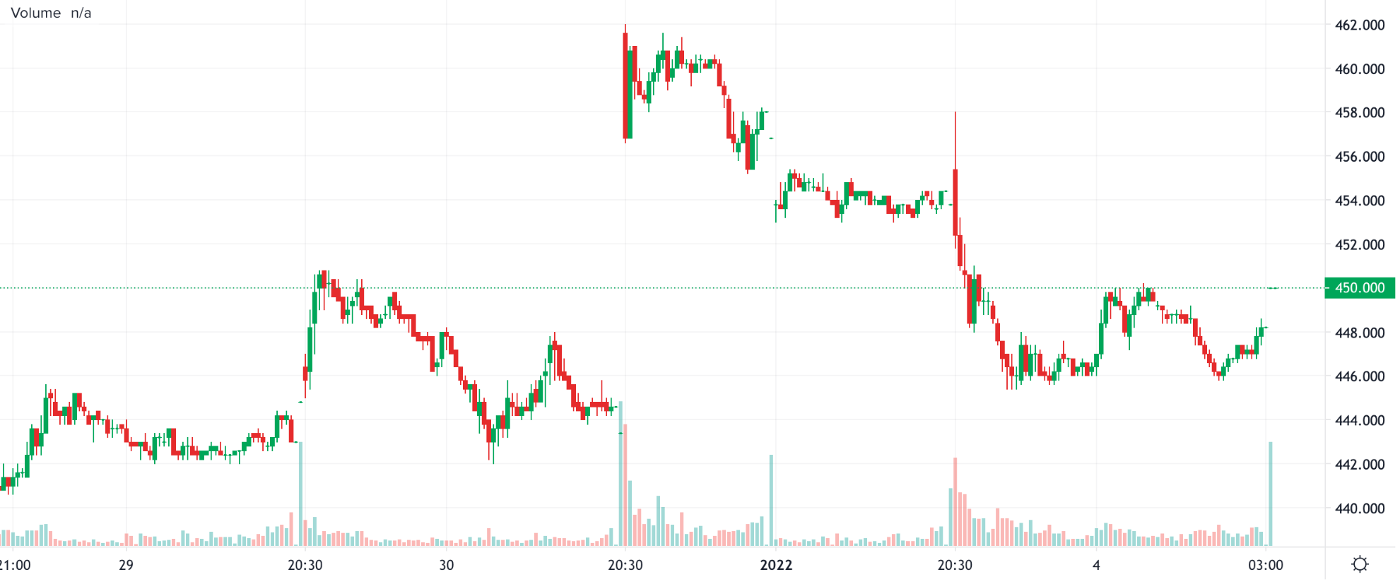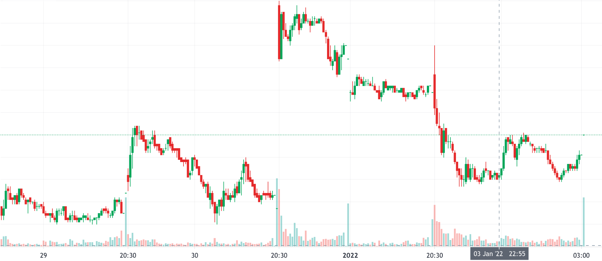 There are no value indicators on the y-axis, so we don't know if the bottom of the chart is zero or if the chart actually shows a narrow price range. The volume indicator shows an increase in volume at the time of movement and at other points before and after the movement, however, that also it difficult to judge because the chart is only for a few days so we can't tell if that volume is typical for that stock.
