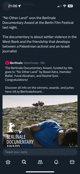 今年柏林电影节全景单元观众奖金熊奖给了“No Other Land”,是一部以色列军队侵占西岸巴勒斯坦人土地的纪录片,这部纪录片是巴勒斯坦电音人和以色列记者一起完成的。