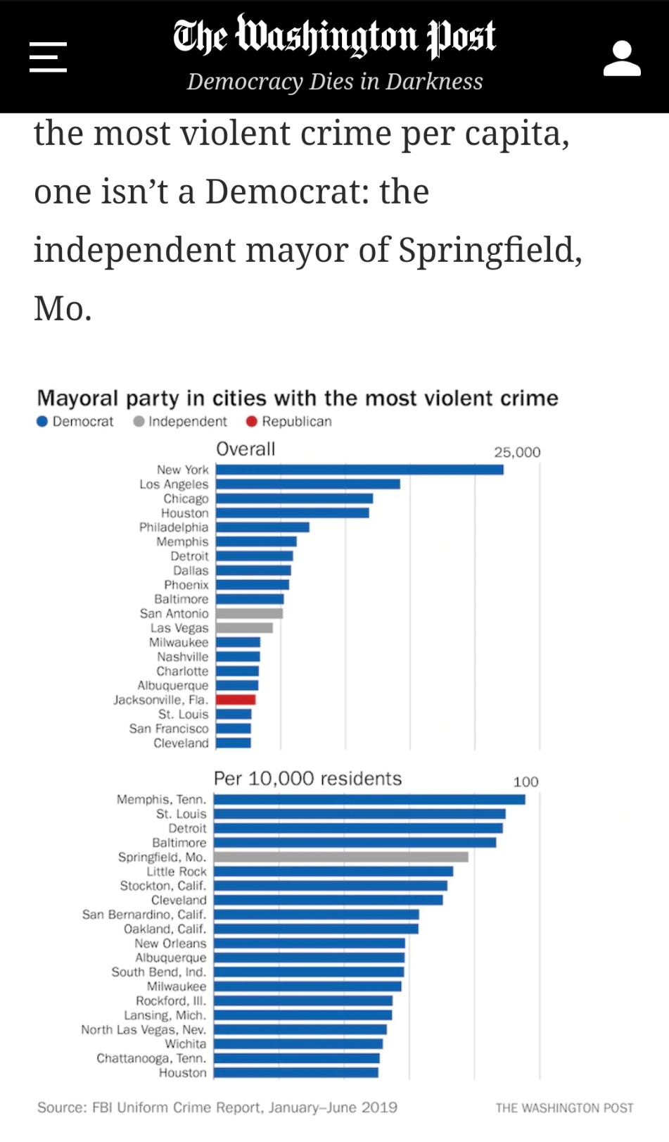Article : Most of the current mayors of these cities are Democrats. Two of the mayors of cities with the most reported violent crimes overall, though, are independents and one, the mayor of Jacksonville, Fla., is a Republican. Among the 20 cities with the most violent crime per capita, one isn’t a Democrat: the independent mayor of Springfield, Mo.