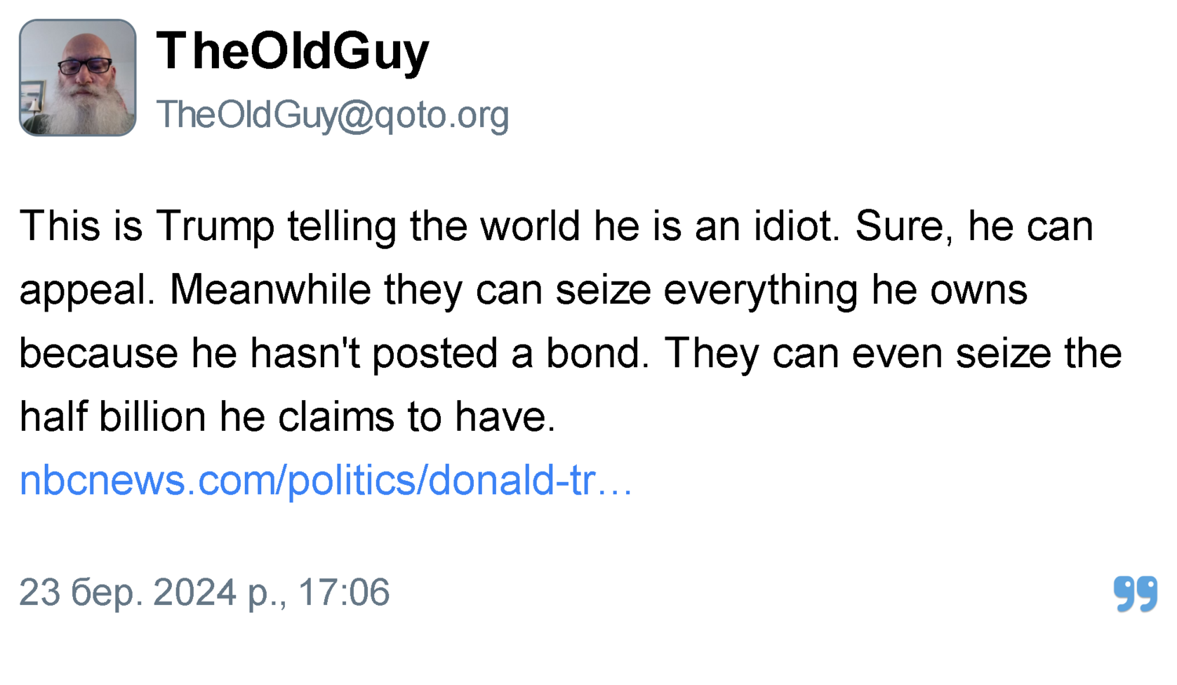This is Trump telling the world he is an idiot. Sure, he can appeal. Meanwhile they can seize everything he owns because he hasn't posted a bond. They can even seize the half billion he claims to have.