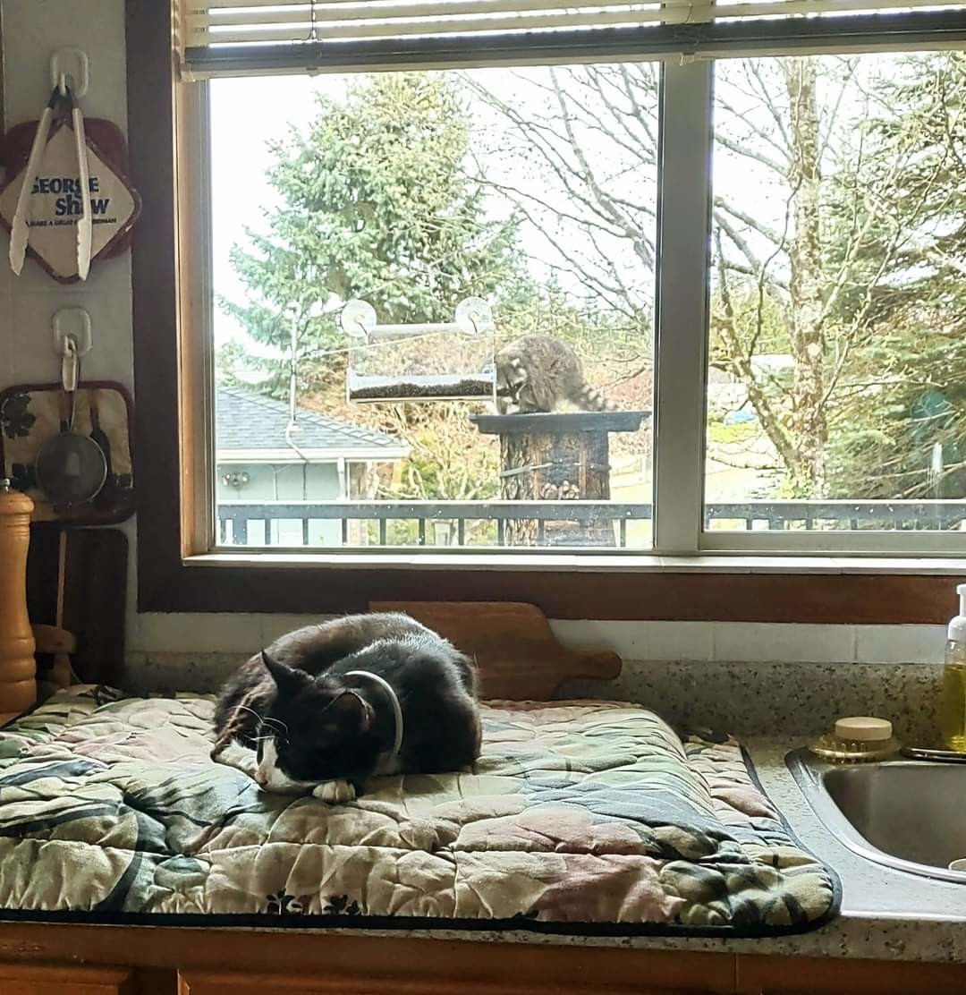 The one place in the house that countertop life is allowed. Just above Frankie's ears is a clear suction cup bird/squirrel feeder. No cat-entertainer needed in this house.