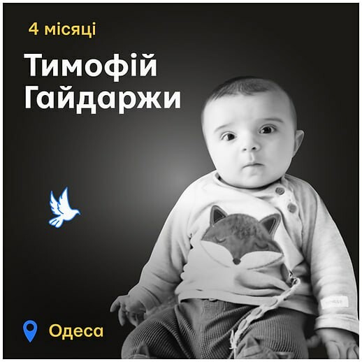 The life of four-month-old Tymofiy Haydarzhy was taken by the Russian shelling of Odessa on March 2, 2024. He and his mother , Anna, ended up under the rubble of the house.