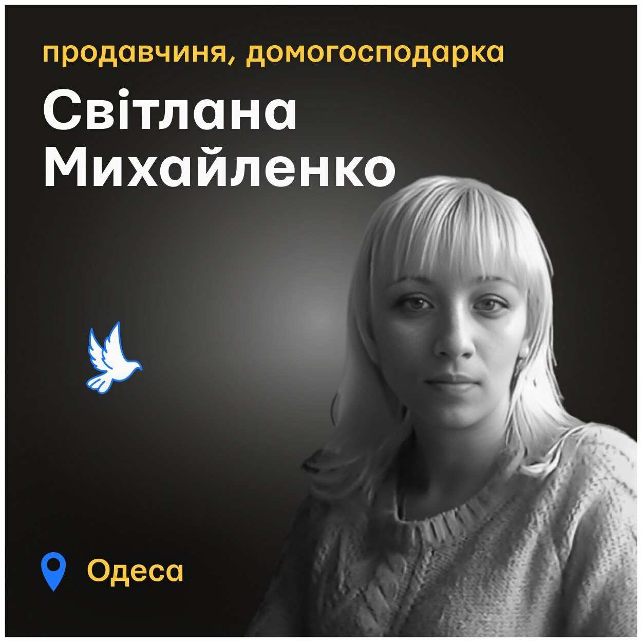 Svitlana Mykhailenko was at home when an enemy missile came and took her life. It happened on 15 March 2024 in Odesa.