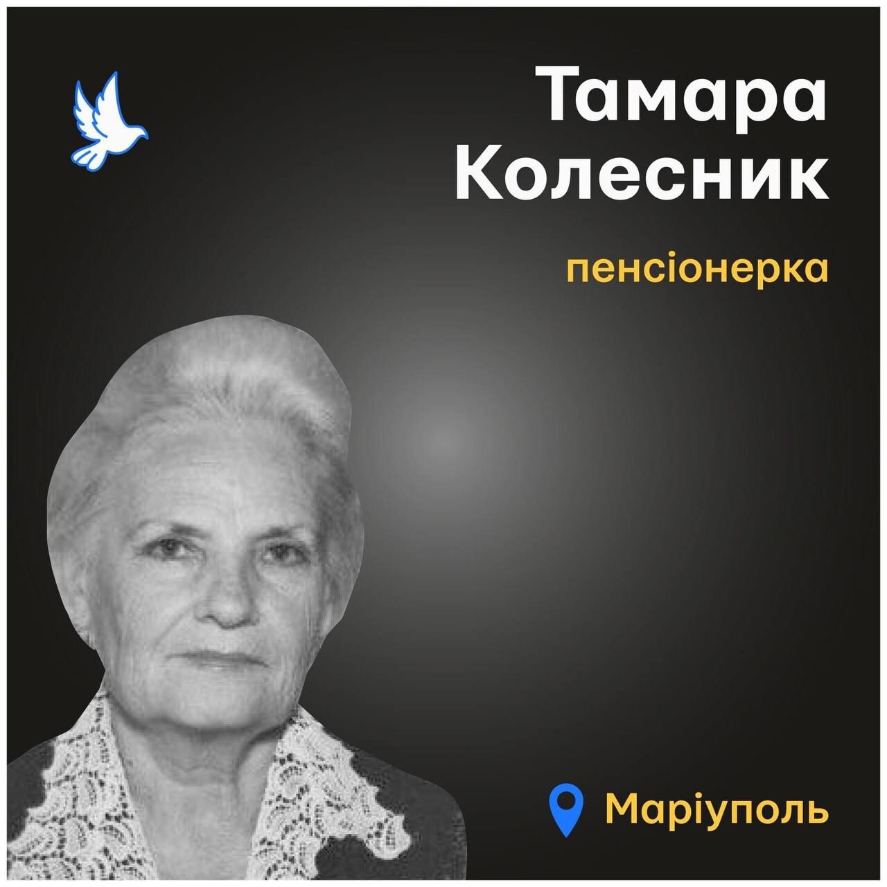 Tamara Kolesnyk died as a result of shelling in Mariupol on March 19, 2022. The 90-year-old woman stayed in her apartment until the end, as there was no way to evacuate her from the besieged city.