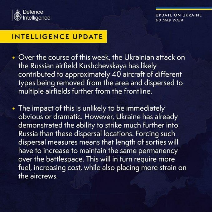 According to British intelligence, the Ukrainian attack on the Russian airfield "Kushchevska" probably contributed to the fact that about 40 aircraft of various types were withdrawn from this area and dispersed to several airfields located further from the front line.