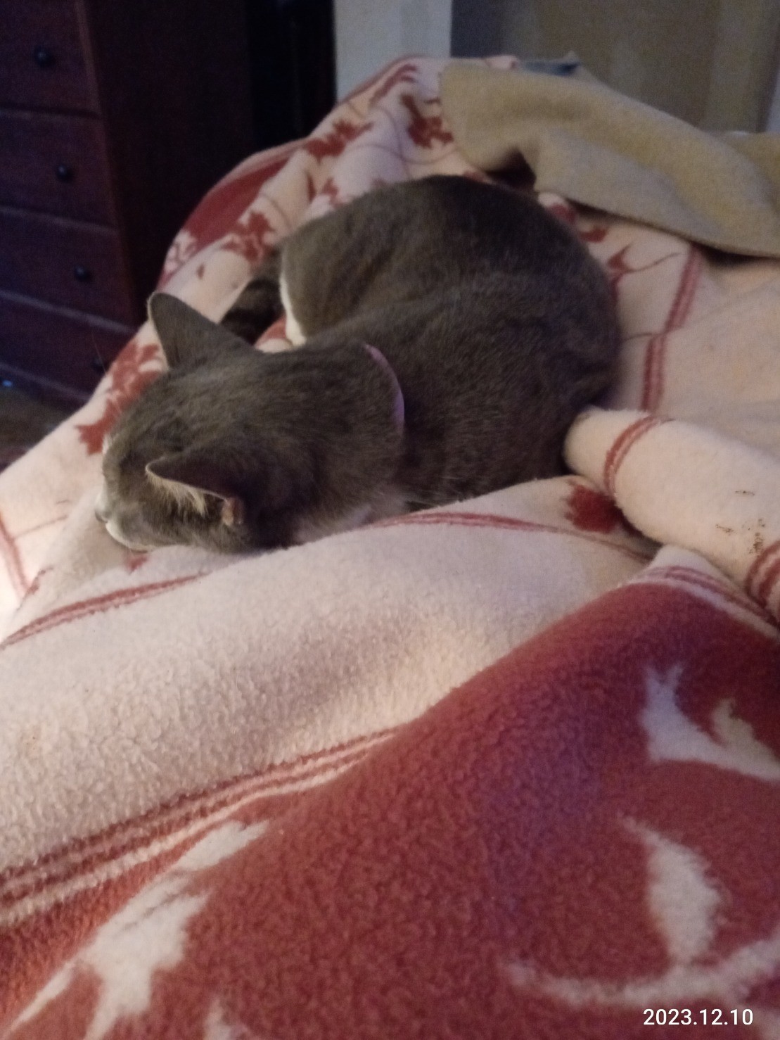 The cat and I are enjoying this very warm wool blanket from Korea. Back in 1975, when I was packing up to ship out to Ft Wainwright in Fairbanks, AK a fellow soldier gave me this very heavy, very thick blanket.