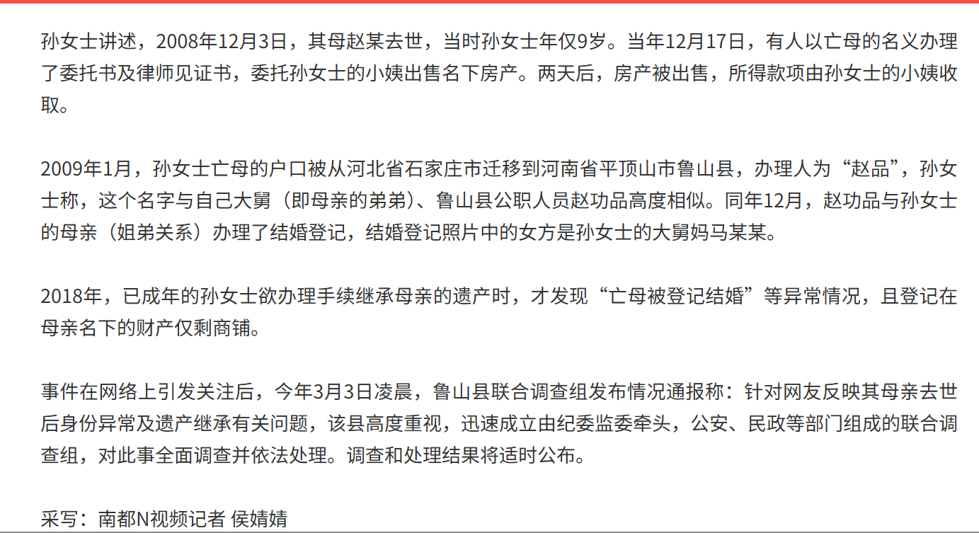 河南平顶山鲁山县政法委副书记赵功品,在亲姐姐去世后将她的户口从河北石家庄迁到鲁山,并让自己老婆出面顶替姐姐的名字办理手续,与姐姐登记结婚;之后陆续将姐姐生前财产转移到自己名下。现在被长大成人的姐姐遗孤举报,在网上闹大后被平顶山成立调查组专案处理。