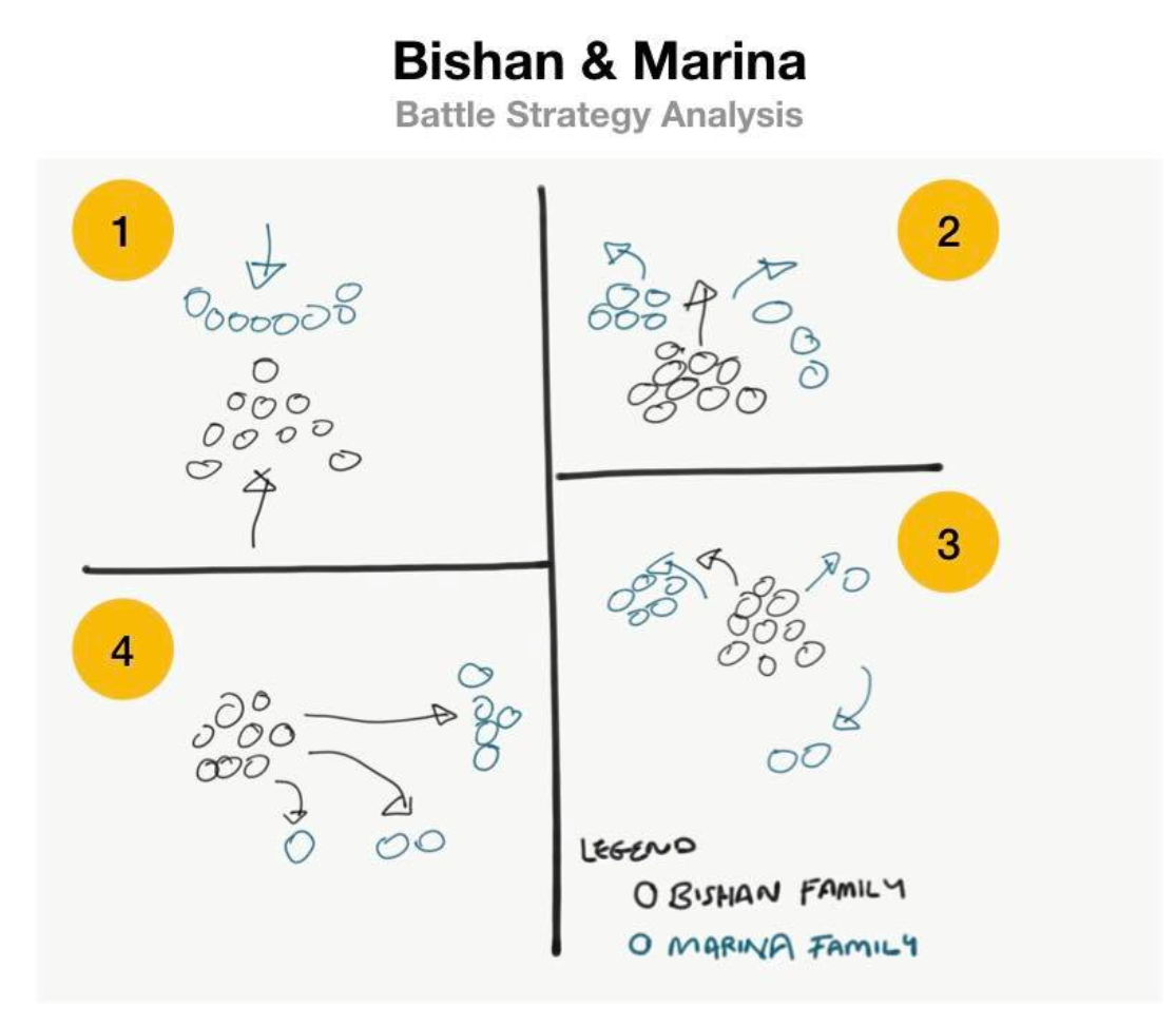 纵观十二年战争史,碧山组屡战屡胜,堪称当地最强水獭家族。人类甚至详细分析了它们的战术(见图2),可以说是分割阵型、各个击破的典范。