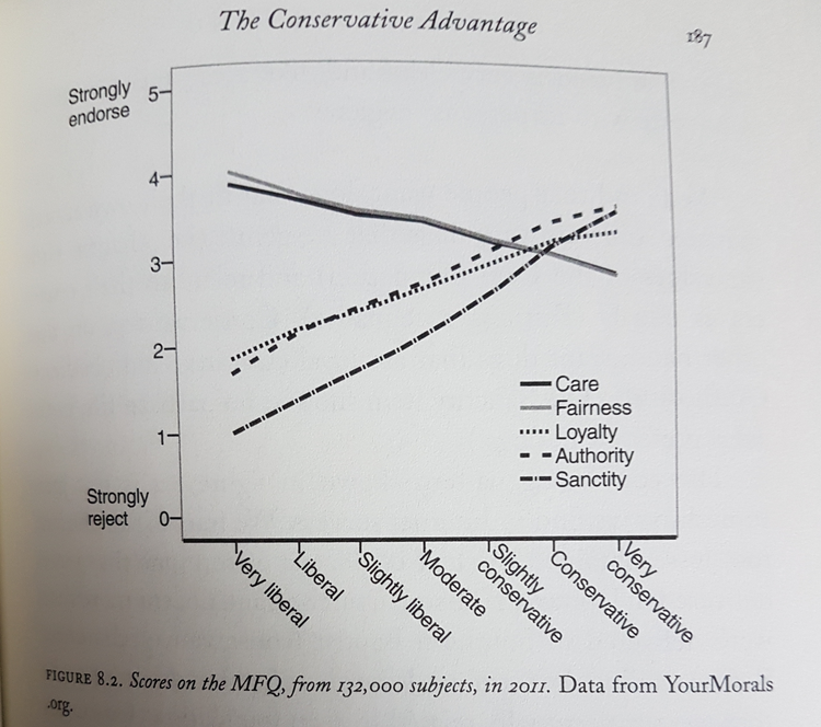 窝以前常看的一个读书博客(RIP) 写过一篇《驴象分辨术》,读的是 Jonathan Haidt 的《The Righteous Mind》,书里归纳了人的五个道德模块:Care-关爱 Fairness-公平 Loyalty-忠诚 Authority-权威 Sanctity-圣洁。这文本意讨论美国两党区别,不过我就光记住一个 Sanctity 圣洁 叻,保守神器就是说。