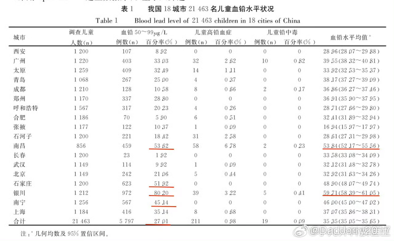【冷知识:如果以美国的铅中毒诊断标准,中国有多个大城市的儿童人均血铅水平是铅中毒】