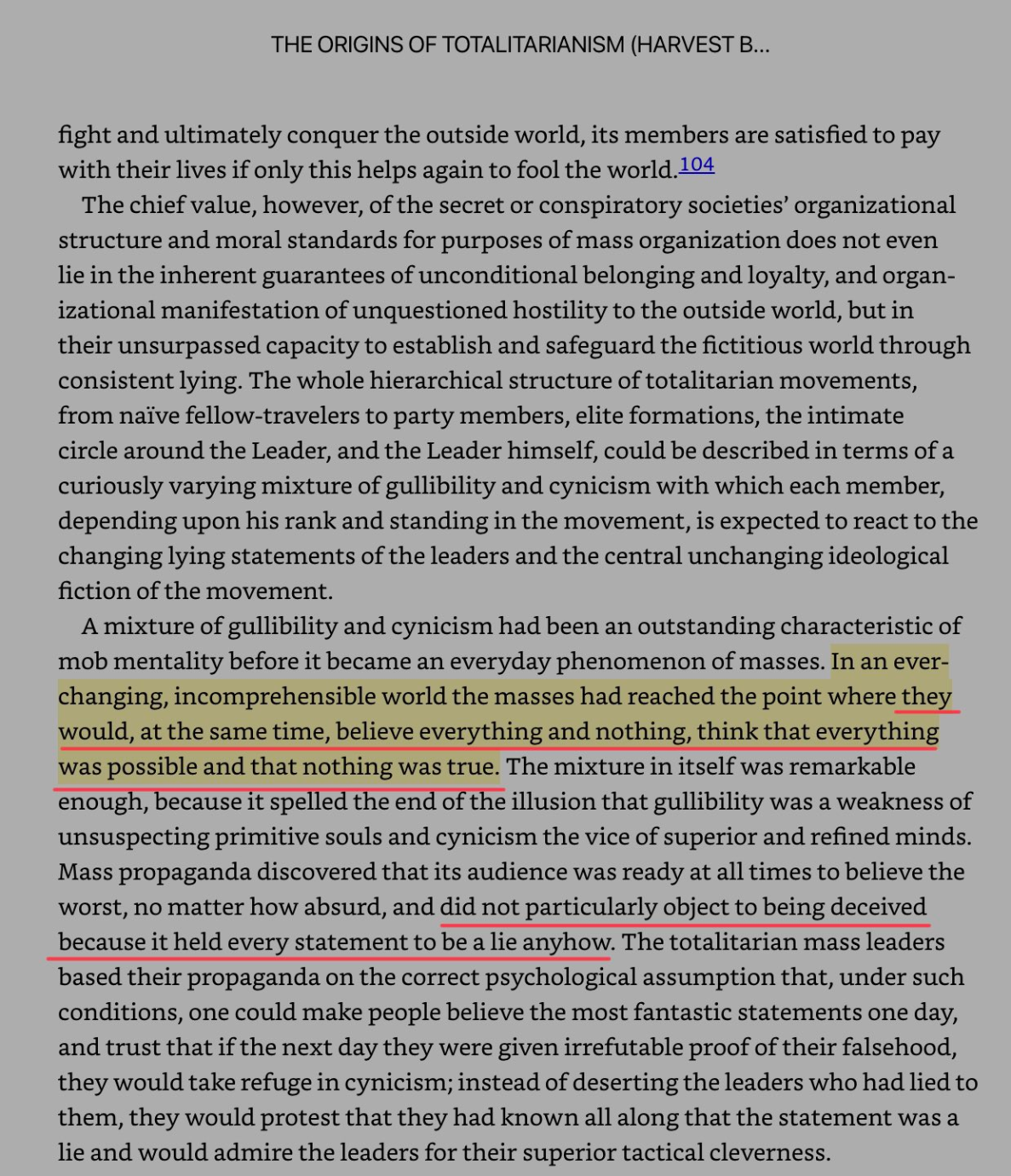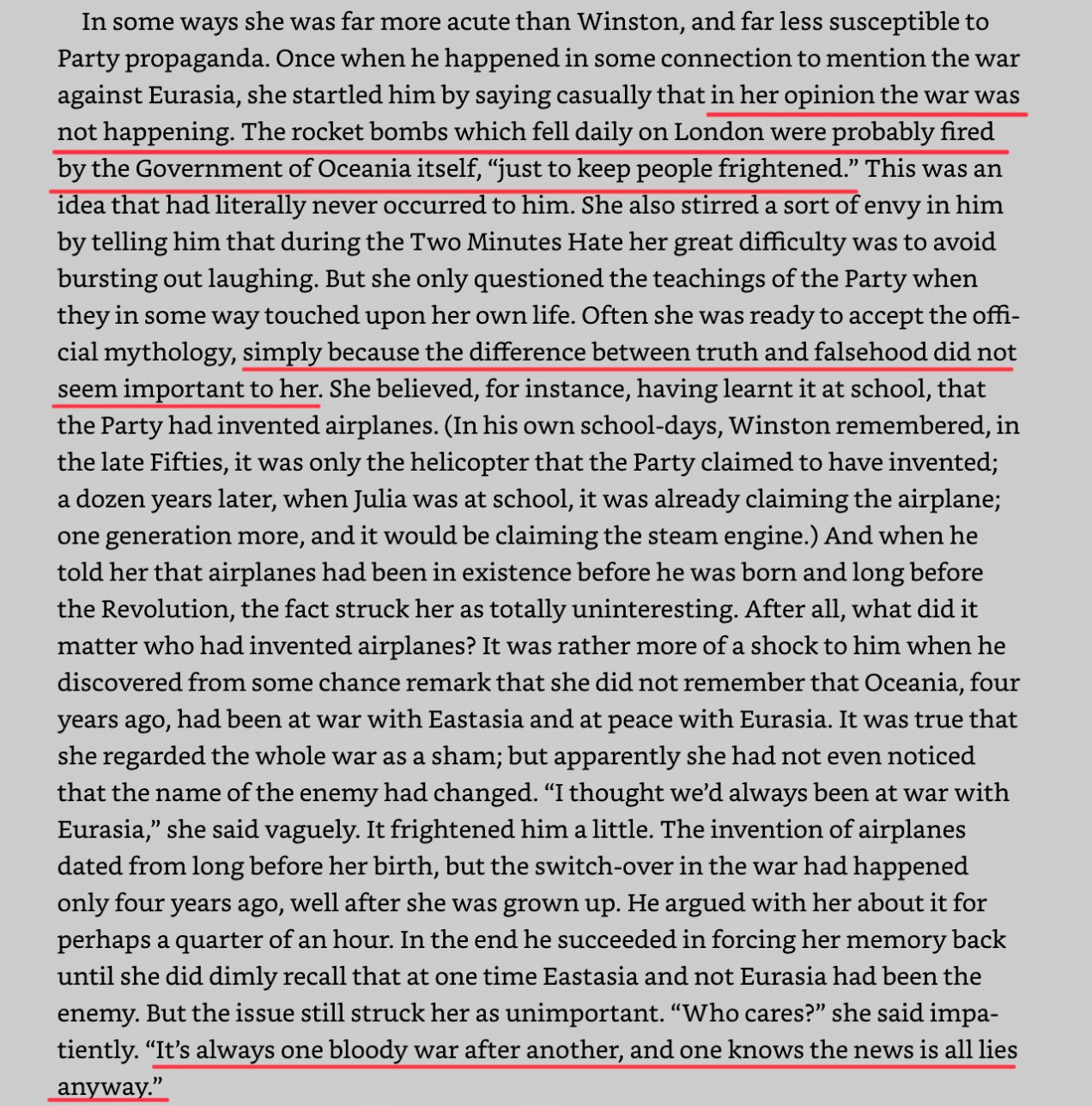 前几天看1984看到这段,太眼熟了,和极权主义的起源里说的一模一样。另外还想起 darth putin 经常说的这句。。