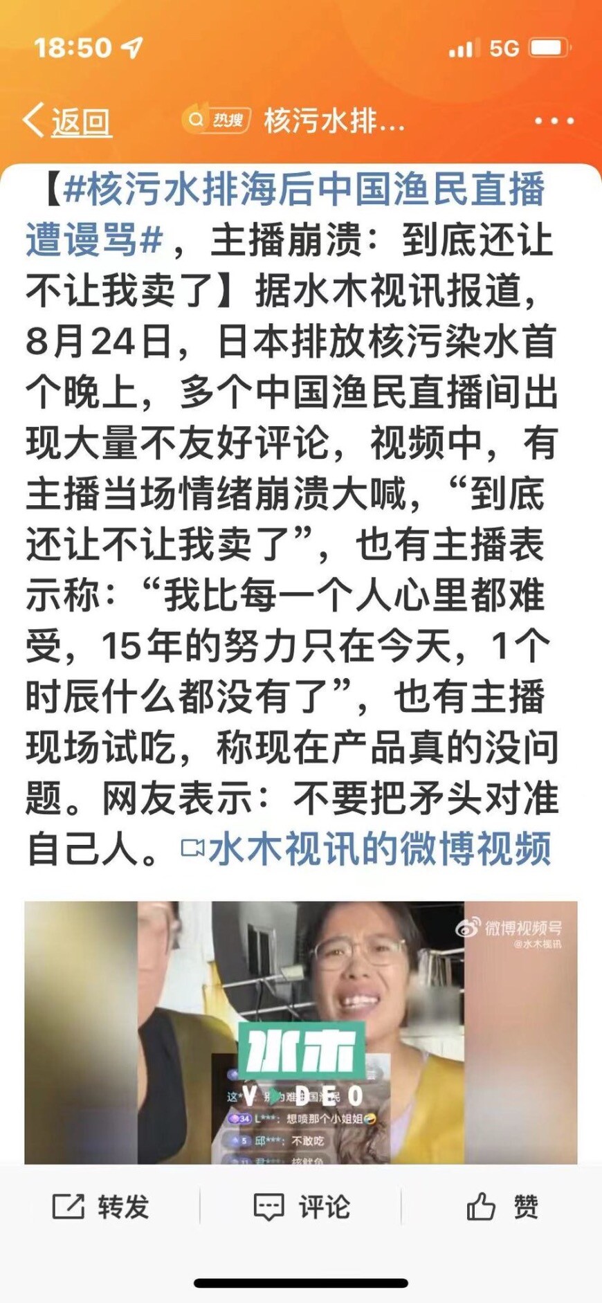 李剑芒@jianmang054A在微博上发了一条科普福岛核废水排没那么可怕的微博,在获得1.2万人点赞后,此条微博被删除了,账号被封禁。