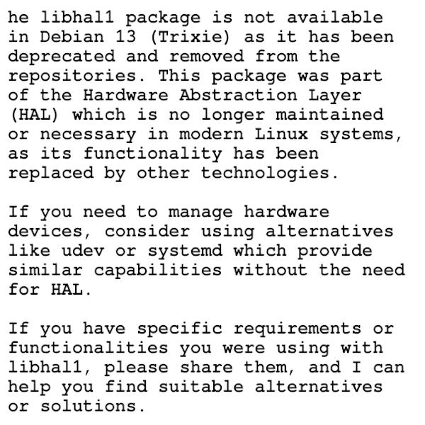 Anyone know how to get libhal1 for debian 13? All i find is similar, but different stuff like libhal1-flash or libhalide.