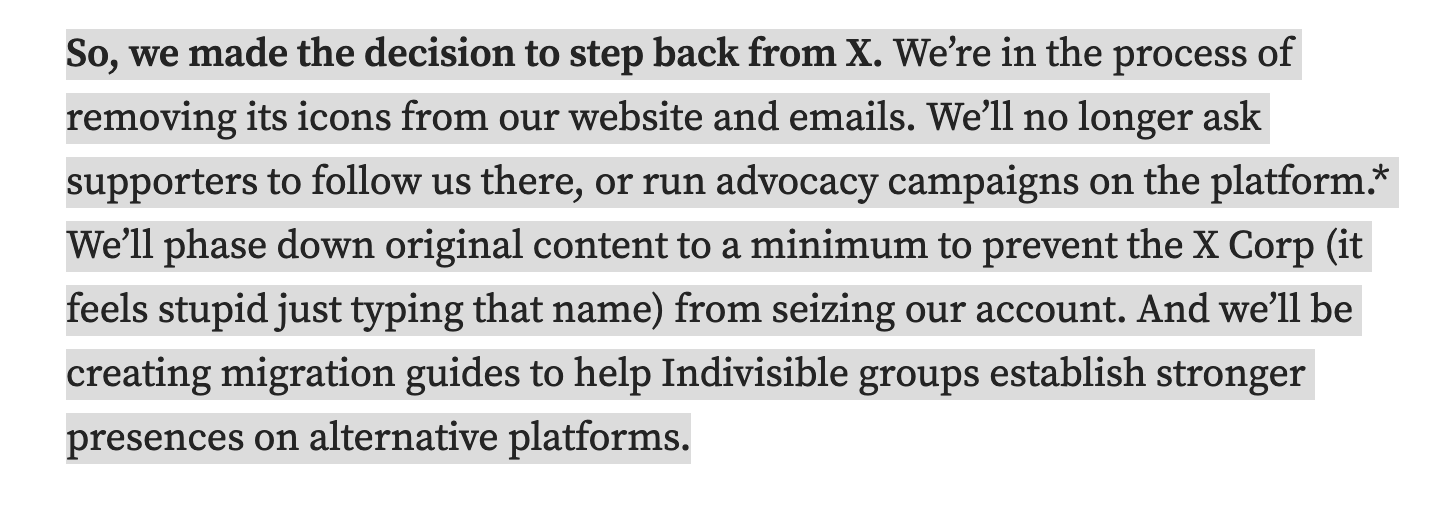 🔥 This is really important news from @indivisibleteam - it is the first progressive org of its size to do this in the US, and think they will set the model that many others will follow. They deserve our kudos and a warm welcome from the Fediverse for this choice.