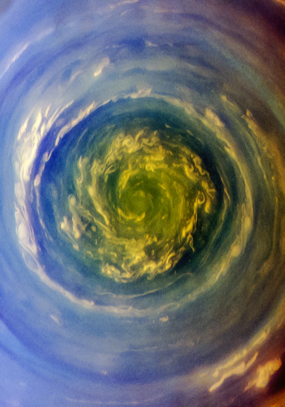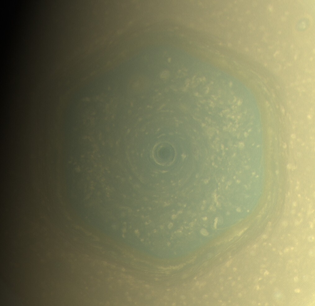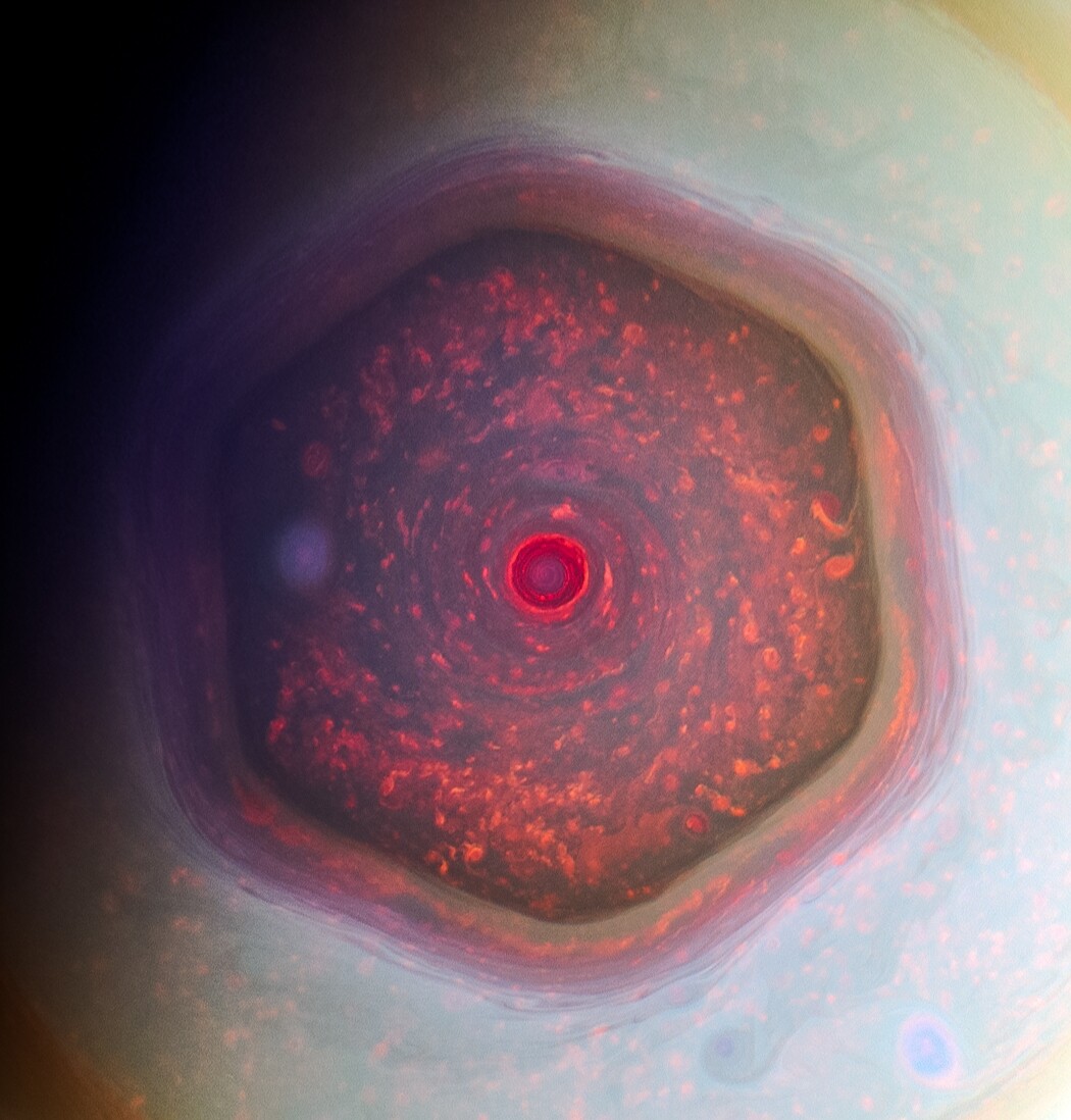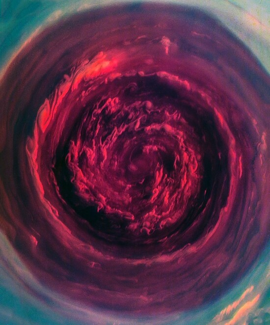 Saturn's North Pole is freaking awesome. The polar latitudes are bounded by jet streams which form it into a hexagon. The pole itself is a huge long lived vortex of terror the size of North America. These images show the hexagon and vortex in natural color and in a near-infrared false color using images taken by NASA's Cassini orbiter.