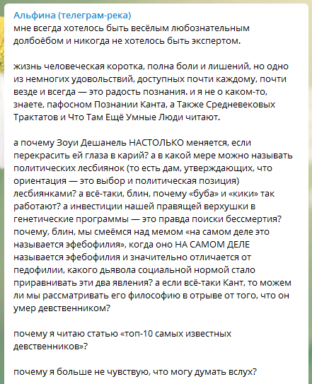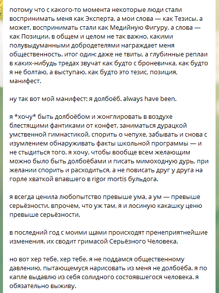 ребята, я долбоёб. always have been. я чувствую, что в последнюю пару лет меня воспринимают слишком серьёзно. эта маска в меня врастает, и я от этого гасну.