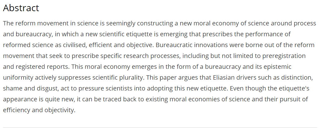 Scientific #reform is all about commitment to, and innovation of, #process and the need to #display both commitment and innovation. The social dynamic surrounding these displays is the topic of my new paper “Process and #bureaucracy: Scientific reform as #civilisation”: https://journals.sagepub.com/doi/10.1177/02704676221126388
