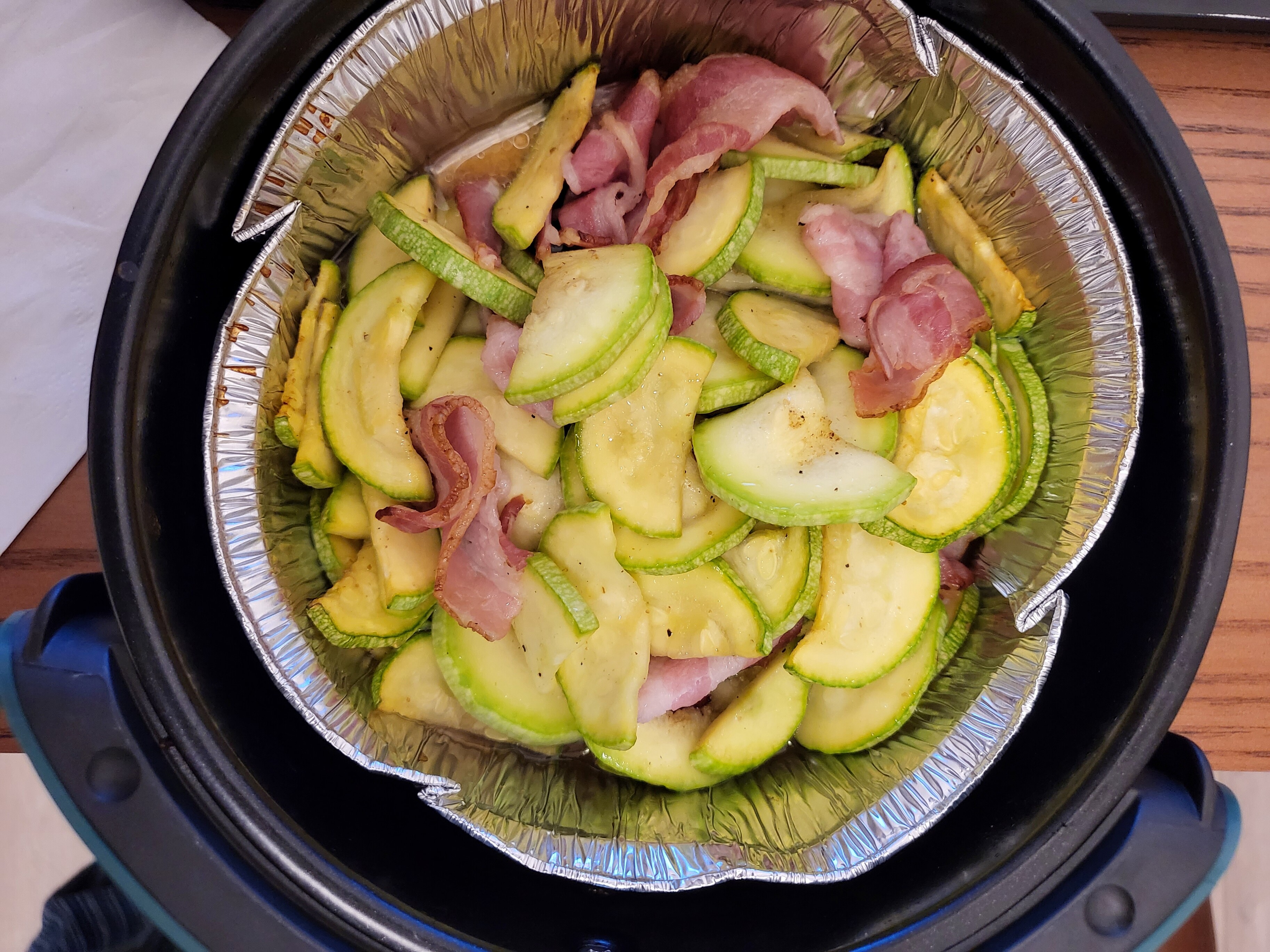 按照网上烤这类瓜的菜谱的话,应该要多炸几分钟,并且腌制完了之后要吸干水分,那样才会脆脆的,但我喜欢偏软一点(主要是懒)所以就这么做了。味道很清爽(没放油),但是没有炒锅做的入味,可能是炒菜过程中培根味会深度渗入瓜中但空气炸平铺就不会,也可能是我盐放少了……不过最重要的是不用洗锅洗盘子,锡纸盘吃完扔掉即可,全程只需要洗电饭煲!